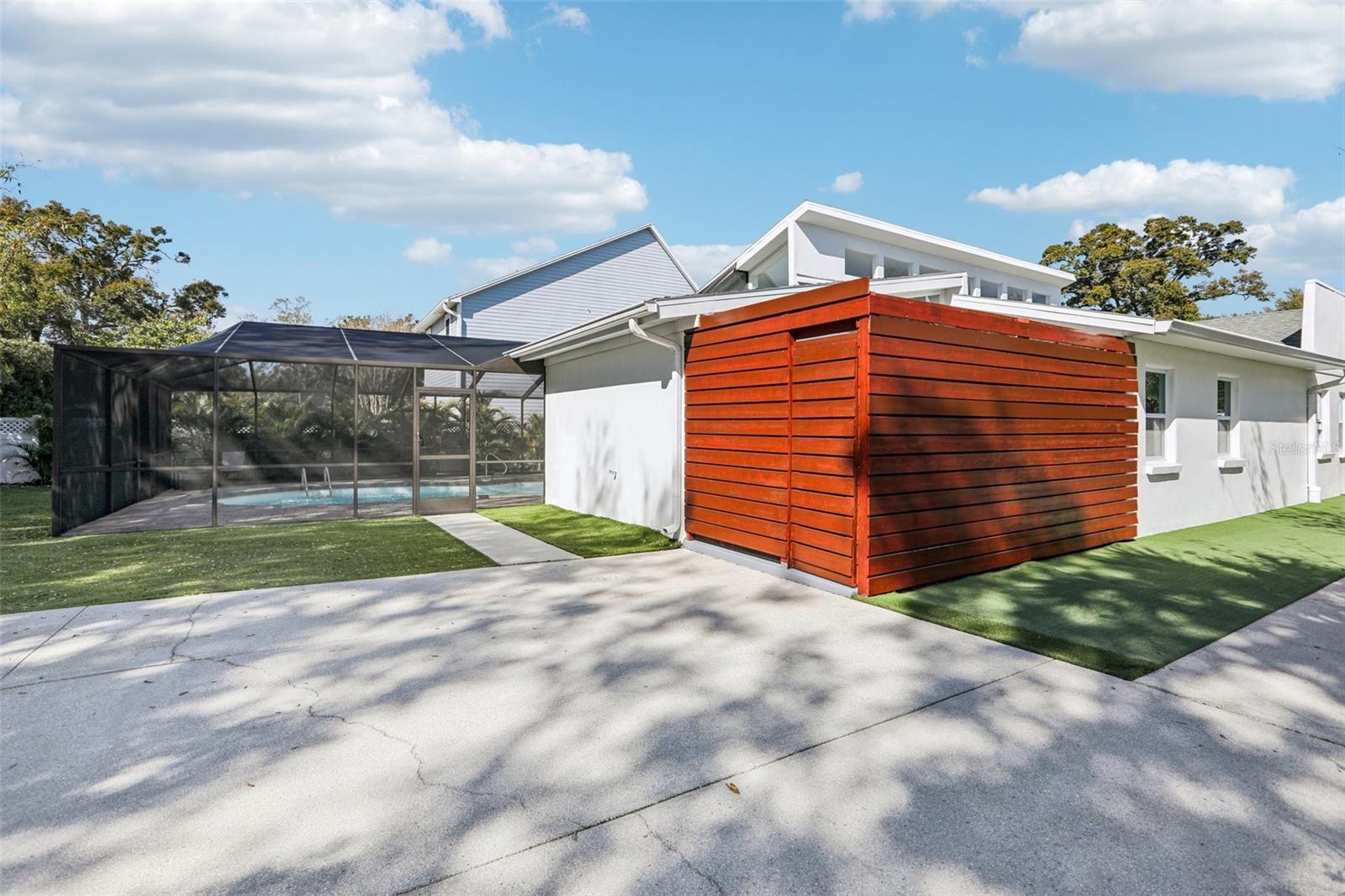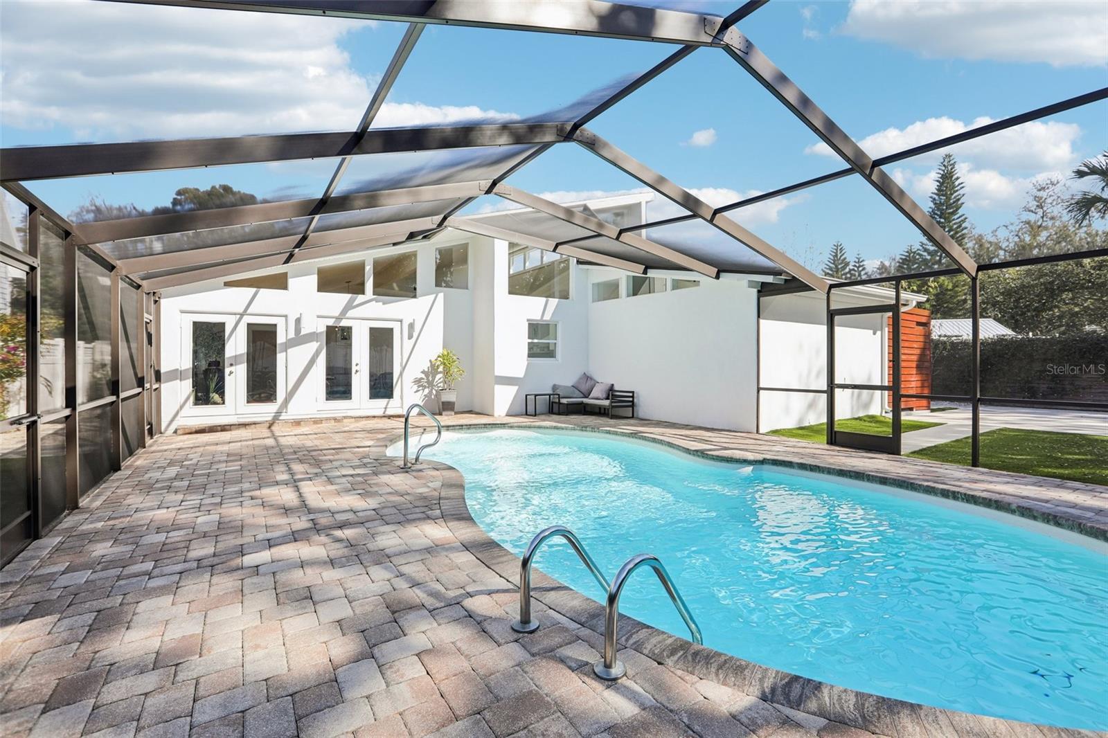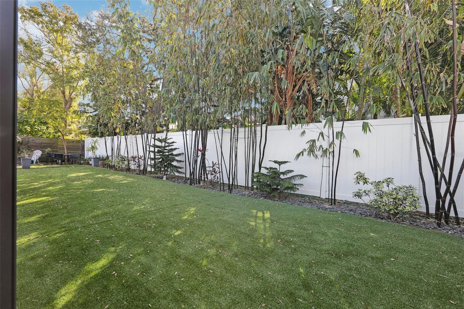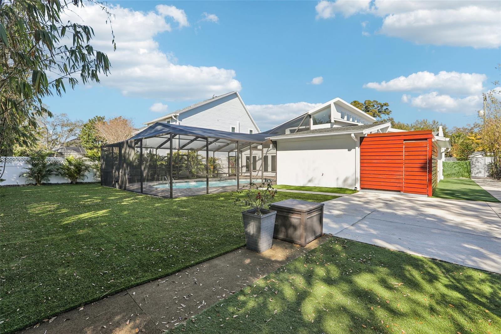 This stunning Mid-Century Modern masterpiece is a true architectural gem completely reimagined in 2016 and continually updated. Located on a spacious and quiet, non-flood zone lot, within the coveted Plant/Coleman/Dale Mabry district, this single level home offers a rare blend of iconic style and refined, easy-maintenance living. Designed with a sophisticated open-concept layout, the home features a seamless indoor/outdoor flow that makes moving between spaces feel completely intuitive. The interior welcomes you with a generous foyer and a private den/office, before opening on a truly grand room with dramatic 20 ft ceilings. Expansive high-reaching windows provide plenty of light during the day and glimpses of the moon and stars at night. The stunning kitchen is a true centerpiece perfect for everyday meals and guests’ entertainment, featuring the large granite social island, solid wood cabinetry, a wine chiller and stainless-steel appliances. The dining area is conveniently located just off the kitchen, making hosting effortless. The primary suite is a sanctuary of calm, boasting an impressive wrap-around walk-in closet and a spa-inspired bath with a center soaker tub and double rainfall showers. For ultimate tranquility, exit to your private Zen-like patio with an outdoor shower—a perfect space for meditation that flows naturally into the backyard. Two additional bedrooms sharing a full bathroom completes the night space. The outdoor space is a world of curated tranquility, where mature, lush landscaping provides a verdant shield of privacy. Extensive premium artificial turf ensures a vibrant, green lawn year-round without the upkeep. Sharpen your short game on the custom private putting green or cool off in the screened-in heated pool. An oversized circular driveway provides ample parking. Conveniently located, it is a short distance to Dale Mabry Elementary, Coleman Middle, Plant High, nearby tennis courts, and baseball fields, and just minutes from shopping, the airport and major highways. With its bright interior, flexible living spaces, and distinctive outdoor amenities, this home is a lifestyle statement in the heart of South Tampa.