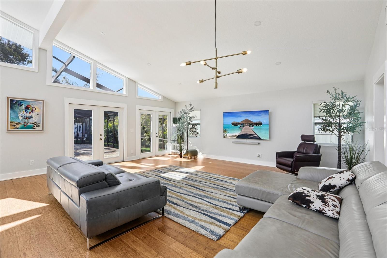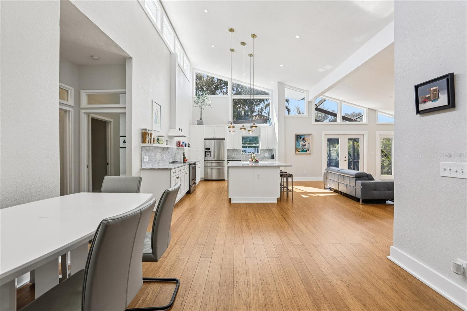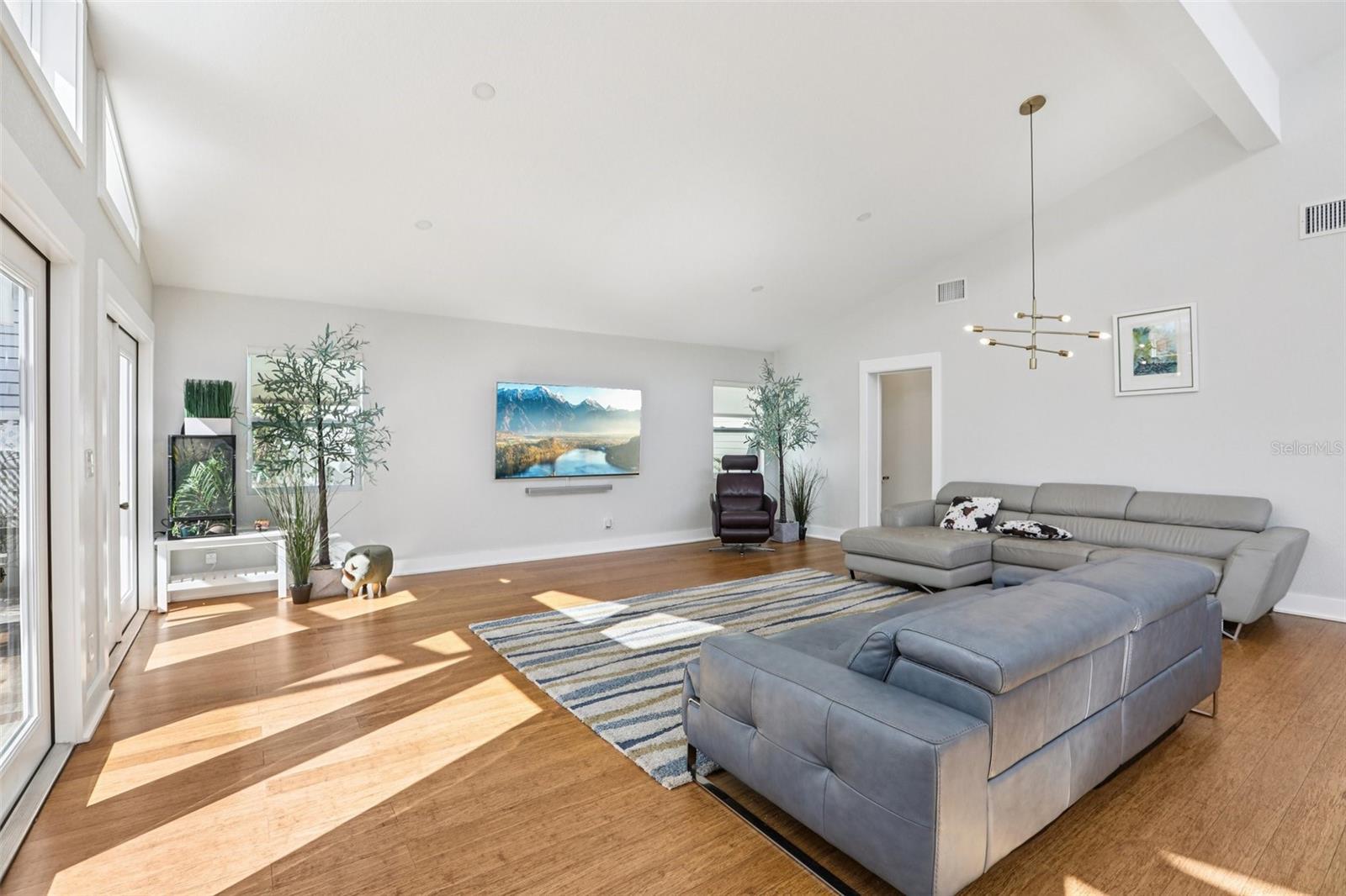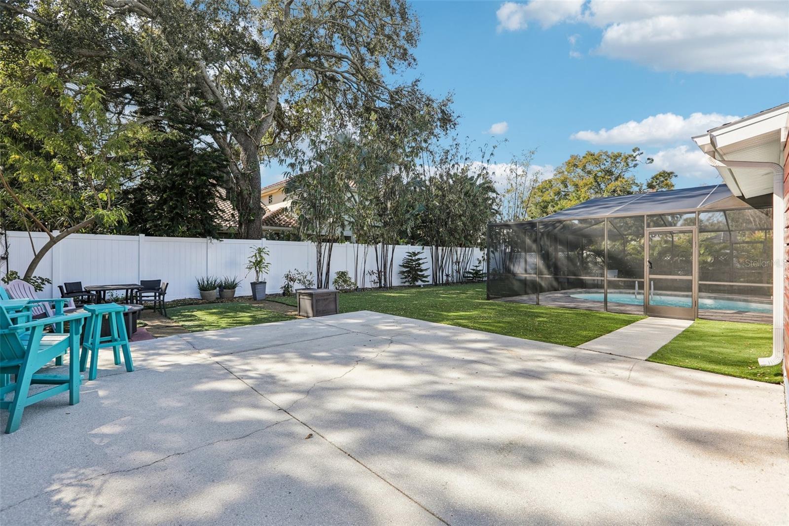 This stunning Mid-Century Modern masterpiece is a true architectural gem completely reimagined in 2016 and continually updated. Located on a spacious and quiet, non-flood zone lot, within the coveted Plant/Coleman/Dale Mabry district, this single level home offers a rare blend of iconic style and refined, easy-maintenance living. Designed with a sophisticated open-concept layout, the home features a seamless indoor/outdoor flow that makes moving between spaces feel completely intuitive. The interior welcomes you with a generous foyer and a private den/office, before opening on a truly grand room with dramatic 20 ft ceilings. Expansive high-reaching windows provide plenty of light during the day and glimpses of the moon and stars at night. The stunning kitchen is a true centerpiece perfect for everyday meals and guests’ entertainment, featuring the large granite social island, solid wood cabinetry, a wine chiller and stainless-steel appliances. The dining area is conveniently located just off the kitchen, making hosting effortless. The primary suite is a sanctuary of calm, boasting an impressive wrap-around walk-in closet and a spa-inspired bath with a center soaker tub and double rainfall showers. For ultimate tranquility, exit to your private Zen-like patio with an outdoor shower—a perfect space for meditation that flows naturally into the backyard. Two additional bedrooms sharing a full bathroom completes the night space. The outdoor space is a world of curated tranquility, where mature, lush landscaping provides a verdant shield of privacy. Extensive premium artificial turf ensures a vibrant, green lawn year-round without the upkeep. Sharpen your short game on the custom private putting green or cool off in the screened-in heated pool. An oversized circular driveway provides ample parking. Conveniently located, it is a short distance to Dale Mabry Elementary, Coleman Middle, Plant High, nearby tennis courts, and baseball fields, and just minutes from shopping, the airport and major highways. With its bright interior, flexible living spaces, and distinctive outdoor amenities, this home is a lifestyle statement in the heart of South Tampa.