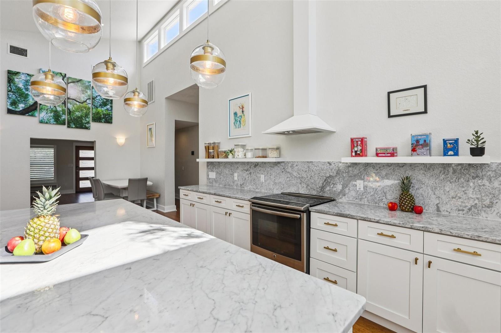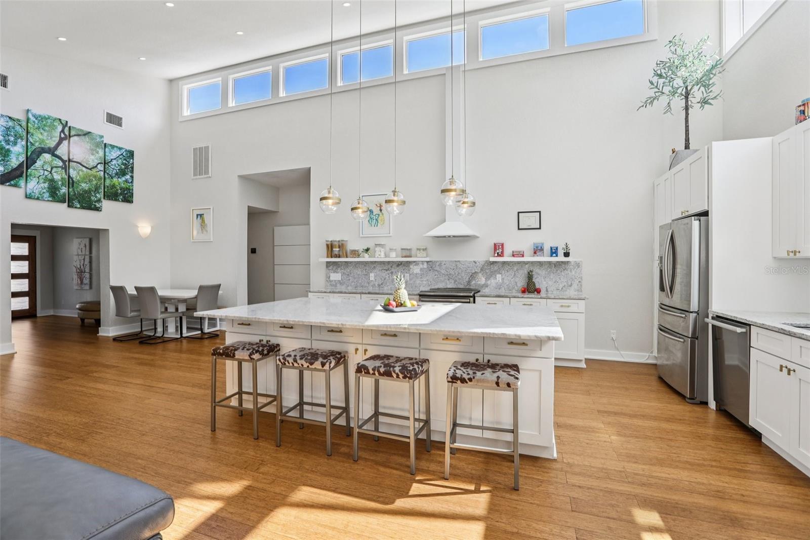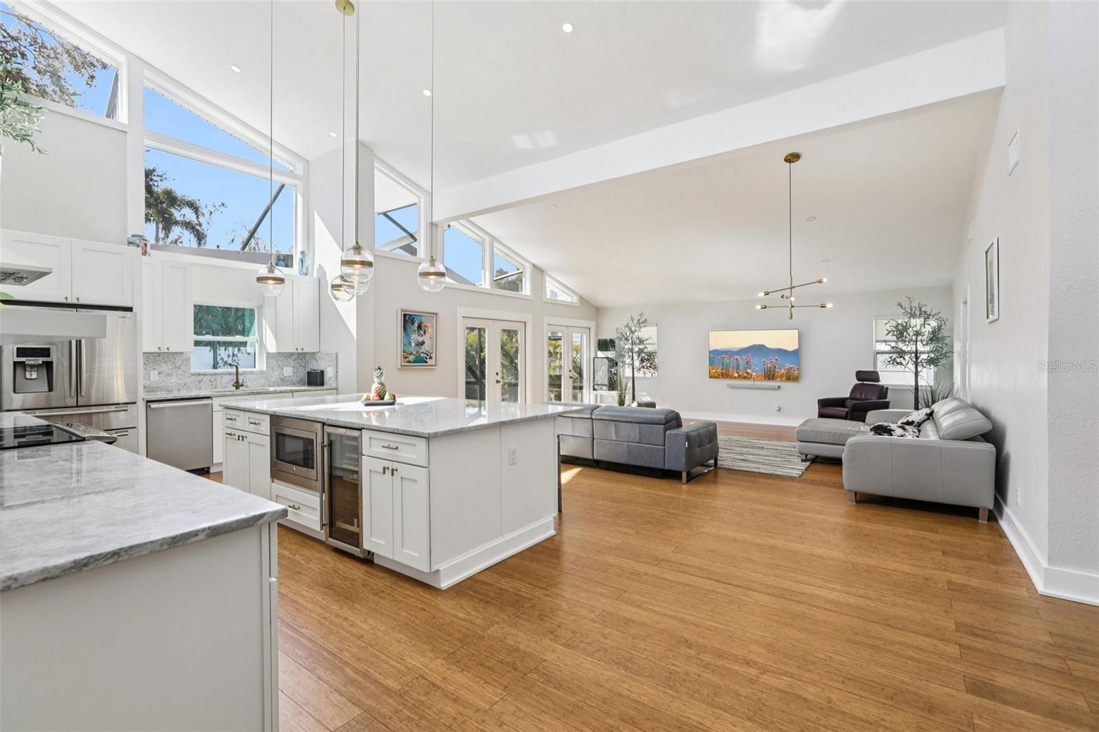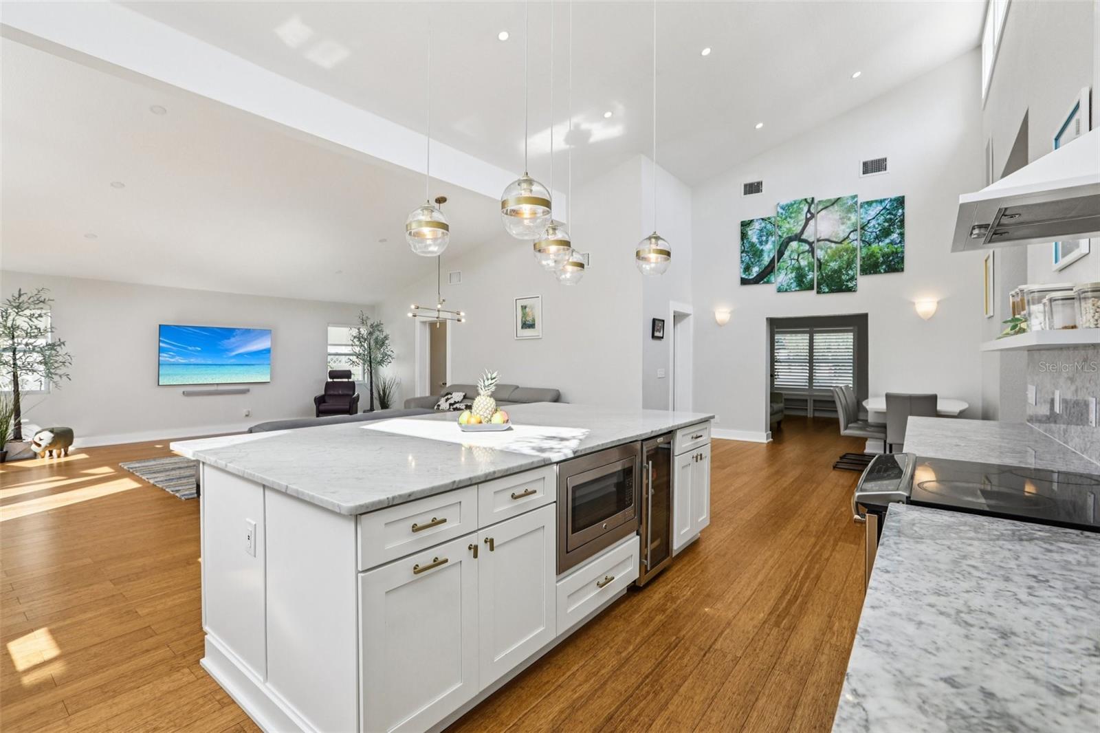This stunning Mid-Century Modern masterpiece is a true architectural gem completely reimagined in 2016 and continually updated. Located on a spacious and quiet, non-flood zone lot, within the coveted Plant/Coleman/Dale Mabry district, this single level home offers a rare blend of iconic style and refined, easy-maintenance living. Designed with a sophisticated open-concept layout, the home features a seamless indoor/outdoor flow that makes moving between spaces feel completely intuitive. The interior welcomes you with a generous foyer and a private den/office, before opening on a truly grand room with dramatic 20 ft ceilings. Expansive high-reaching windows provide plenty of light during the day and glimpses of the moon and stars at night. The stunning kitchen is a true centerpiece perfect for everyday meals and guests’ entertainment, featuring the large granite social island, solid wood cabinetry, a wine chiller and stainless-steel appliances. The dining area is conveniently located just off the kitchen, making hosting effortless. The primary suite is a sanctuary of calm, boasting an impressive wrap-around walk-in closet and a spa-inspired bath with a center soaker tub and double rainfall showers. For ultimate tranquility, exit to your private Zen-like patio with an outdoor shower—a perfect space for meditation that flows naturally into the backyard. Two additional bedrooms sharing a full bathroom completes the night space. The outdoor space is a world of curated tranquility, where mature, lush landscaping provides a verdant shield of privacy. Extensive premium artificial turf ensures a vibrant, green lawn year-round without the upkeep. Sharpen your short game on the custom private putting green or cool off in the screened-in heated pool. An oversized circular driveway provides ample parking. Conveniently located, it is a short distance to Dale Mabry Elementary, Coleman Middle, Plant High, nearby tennis courts, and baseball fields, and just minutes from shopping, the airport and major highways. With its bright interior, flexible living spaces, and distinctive outdoor amenities, this home is a lifestyle statement in the heart of South Tampa.