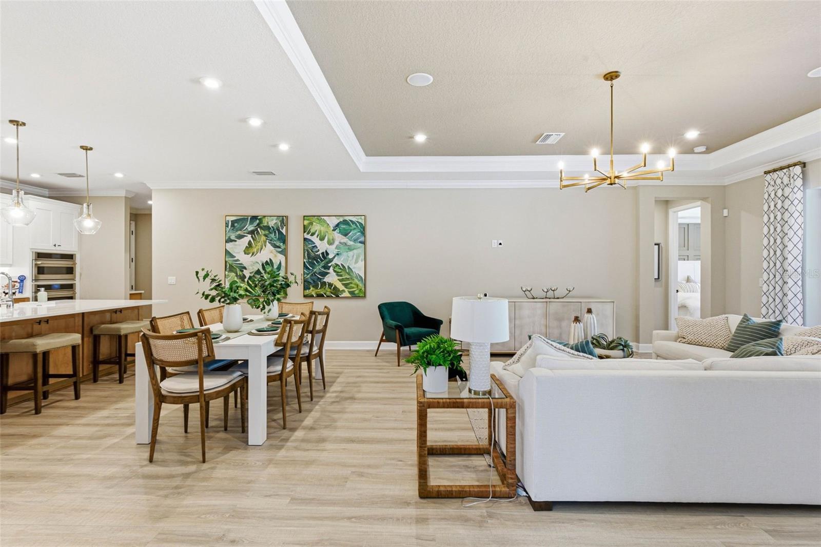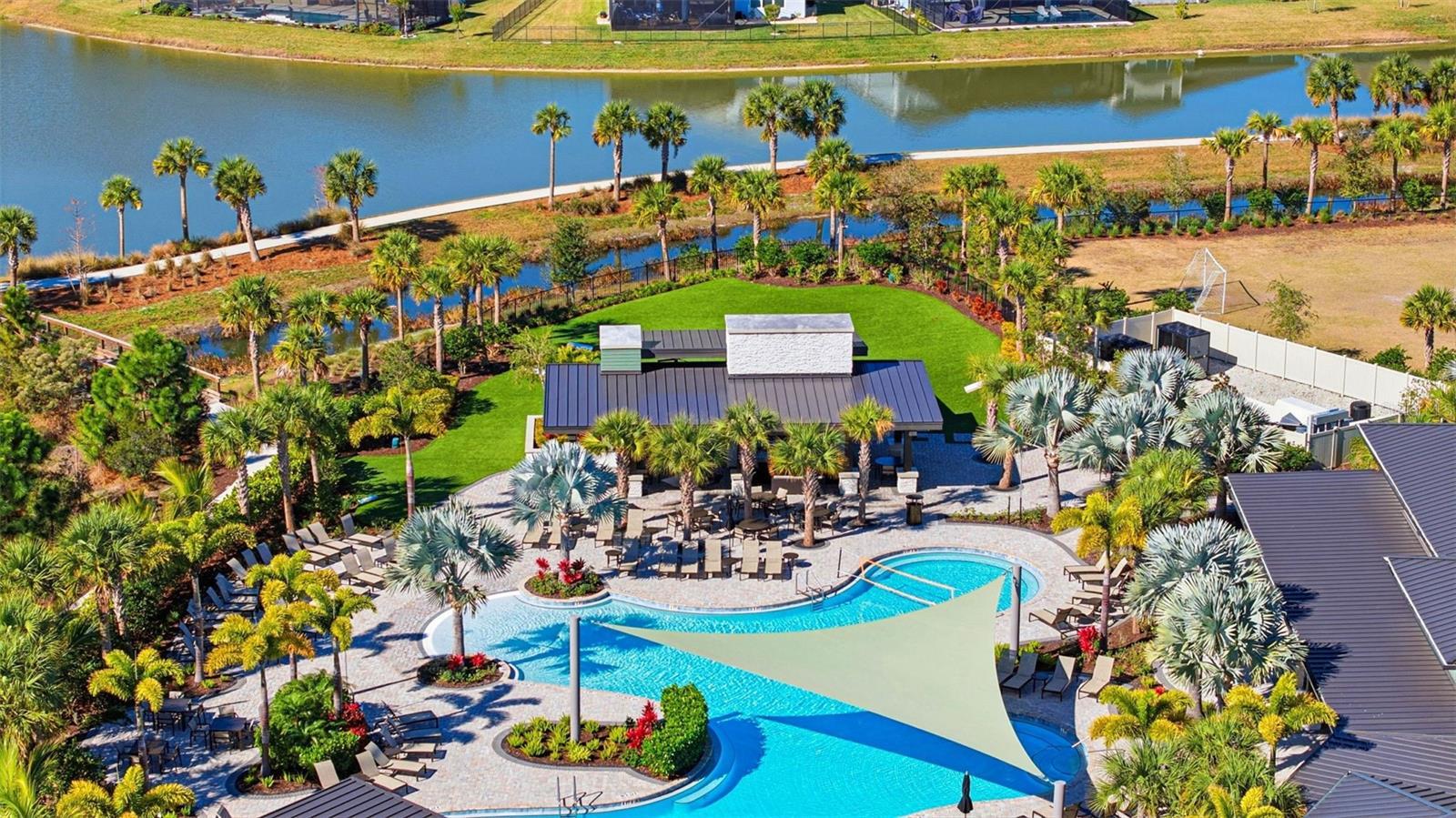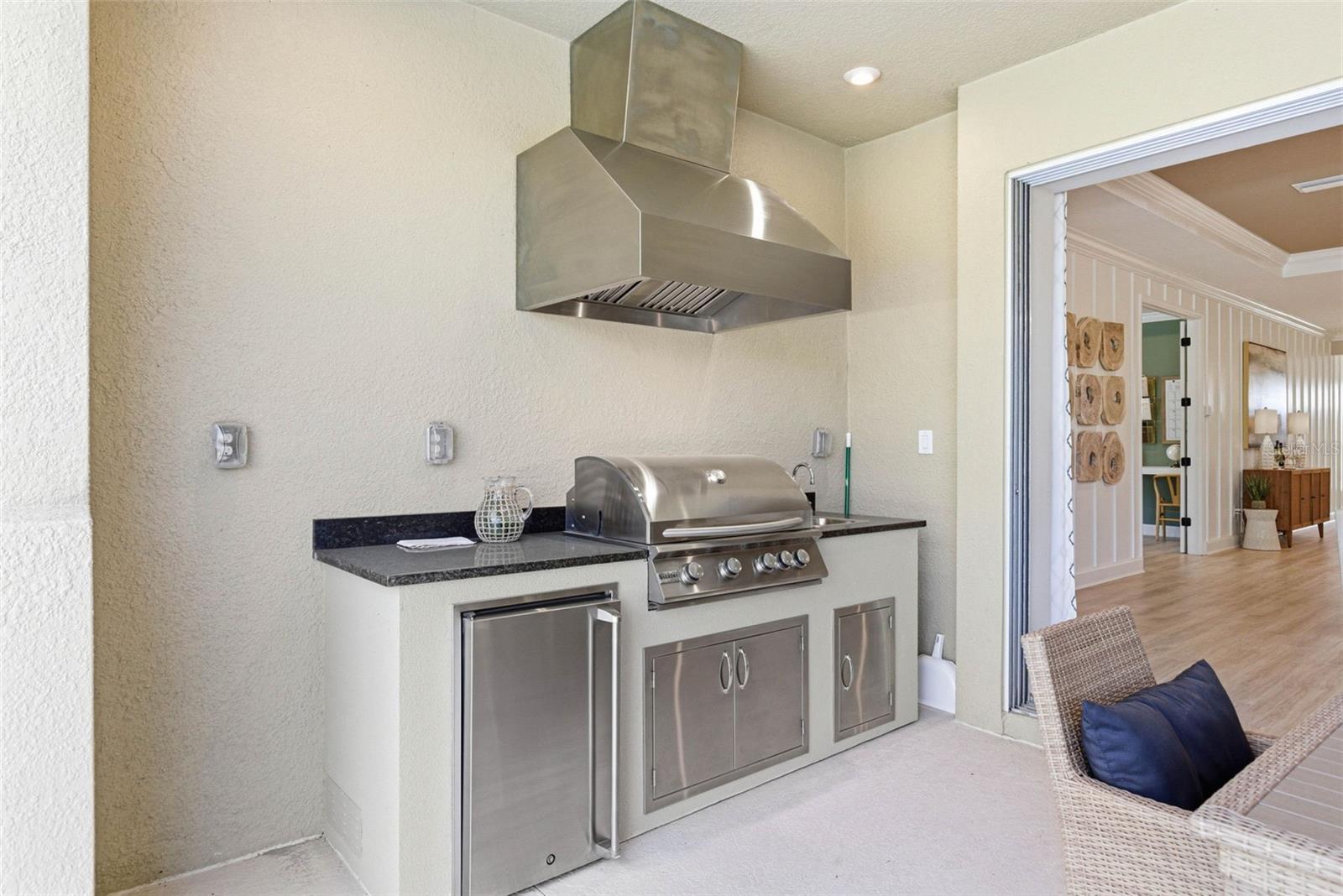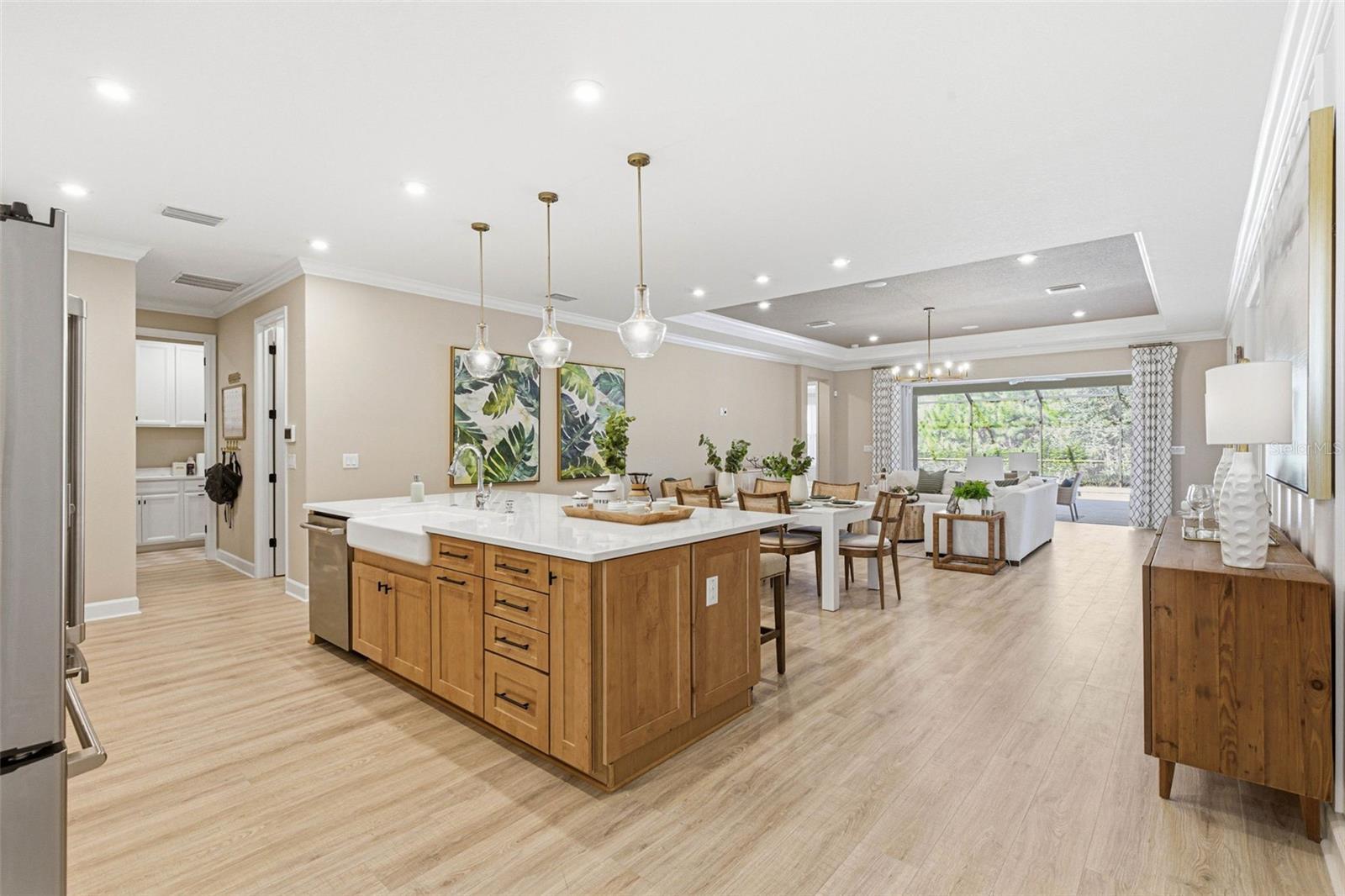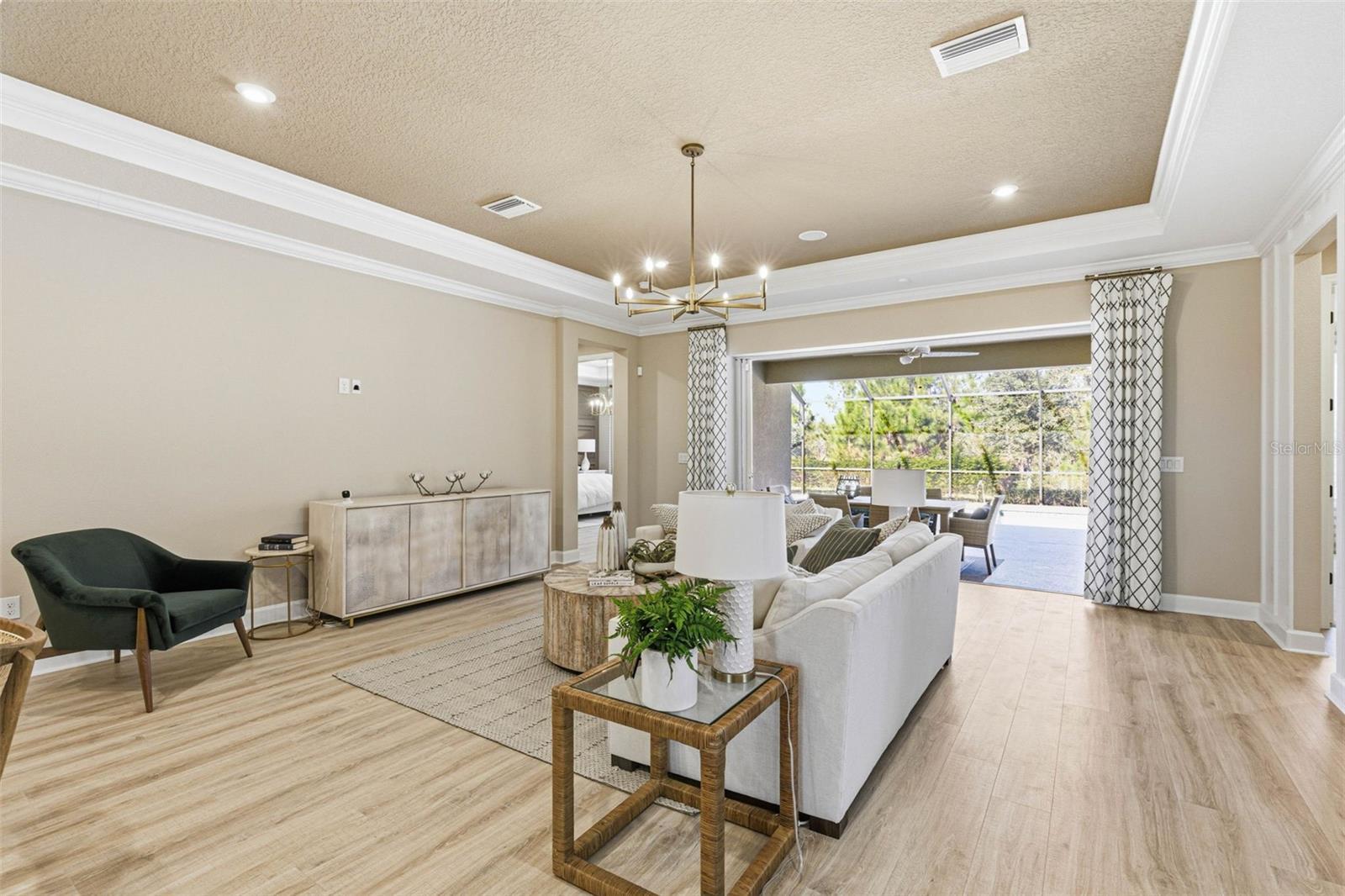 Welcome to this beautiful Saint Croix floor plan, former Model Home, never lived in, offering exceptional curb appeal, POOL and Outdoor kitchen and a refined, designer interior. The home comes with ALL FURNITURE AND DECORATION! This thoughtfully designed 2,921 sq. ft. home features 4 bedrooms and 4.5 bathrooms, with each bedroom offering a private en-suite bath and 3 Car Garage. An inviting foyer welcomes you and provides access to two secondary bedrooms. Beyond the foyer, the home opens to a spacious, open-concept beautifully finished gourmet kitchen with a center island overlooking the gathering room, perfect for entertaining. Pocket sliding glass doors lead to a large covered lanai, where you can enjoy outdoor cooking, spend time by the pool overseeing the view of the conservation lot, seamlessly blending indoor and outdoor living. Upgrades and structural options include tray ceilings, a gourmet kitchen, kitchen island knee wall, floor outlet, study in place of flex space with double French doors, 8-foot interior doors, and pocket glass sliding doors. The owner’s suite features a deluxe bath with a rain showerhead. Additional features include a laundry room cabinetry and sink, outdoor kitchen with vent, private pool, built- in ceiling audio system and thoughtfully selected design enhancements throughout. River Landing community features resort-style amenities, including a heated pool with multiple entertainment areas, grills, clubhouse, fitness center, basketball and tennis courts, a playground, and a small soccer field. Conveniently located along the SR 56 extension, this community offers easy access to shopping, entertainment, and dining options. Don't miss out and schedule your private tour today!