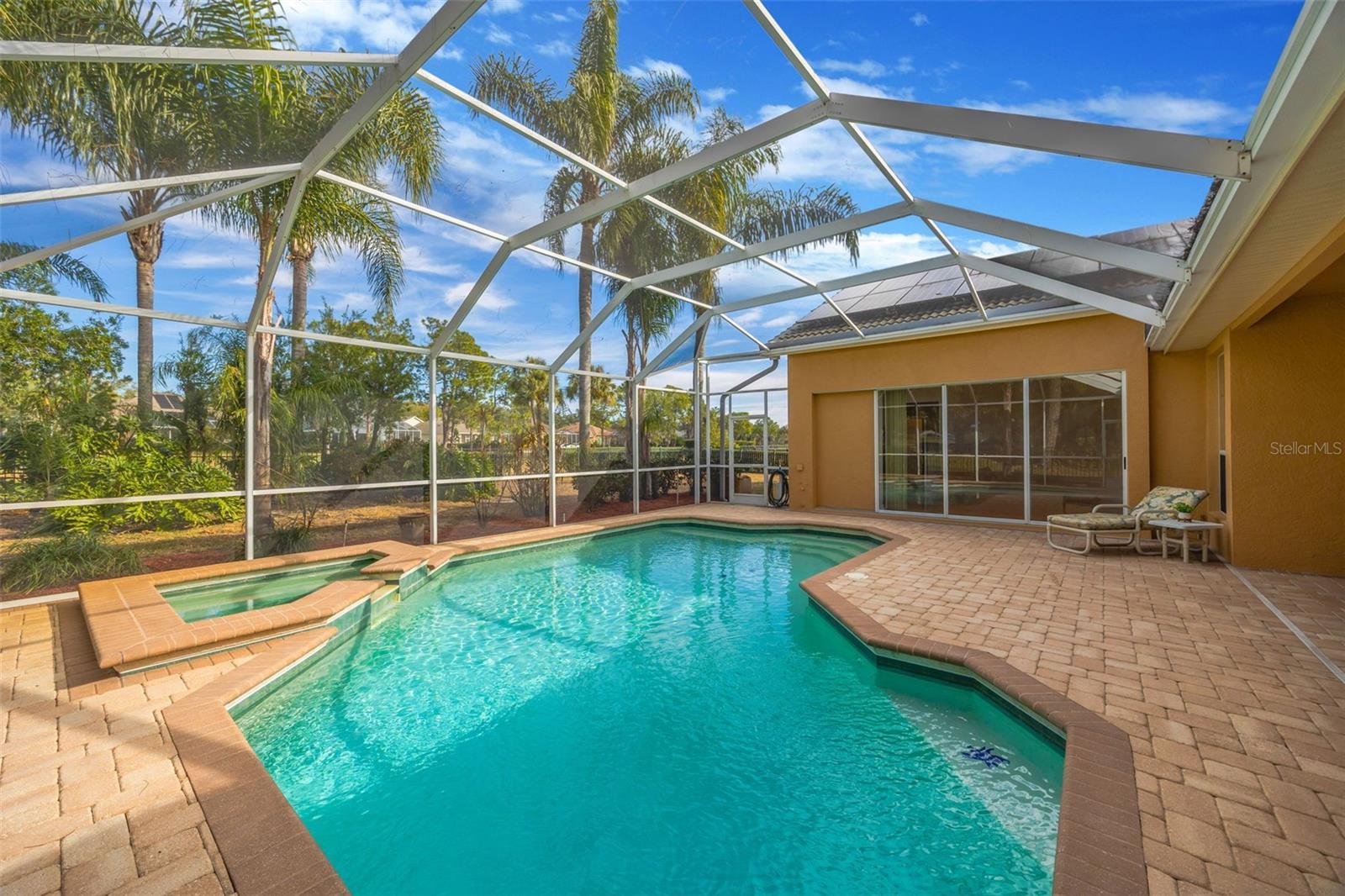 Come see this beautiful and impeccably maintained custom built Hannah Bartoletta pool home in River Hills! 24-hour manned-gated community. Featuring 4 bedrooms, 3 full baths, 3-car garage, large backyard with golf course views and lush landscaping providing intimate privacy ~ this home is move-in ready! The property sits on a 1/3 of an acre corner lot on the quiet cul-de-sac street of Peach Heather Trail! Upon entering, you are greeted by the formal living and dining rooms adorned with beautiful hardwood floors, high ceilings, oversized windows and fresh paint. Through the living room sliding doors your eye is immediately drawn to the outdoor living space complete with sparkling pool, spa and pavered screen enclosure! Traveling into the spacious kitchen you’ll notice the gleaming granite countertops, 42” wood cabinets, closet pantry, breakfast bar and a large center island making food preparation a breeze even for the largest of gatherings! The kitchen flows naturally into the spacious family room with soaring transom windows above the custom built-in entertainment center! The large pocketing sliding doors bring the outside living space in and spill natural light throughout the main living areas ~ perfect for casual entertaining and corporate affairs! The **Triple-Split** floor plan grants privacy for all! Spacious Owner's Retreat features private entry to the outdoor living space, huge walk-in closet, and ensuite bathroom with dual sinks, walk-in shower, and large spa-tub. The secondary bedrooms are oversized with ample closet space, high ceilings, and plush new carpet! The office is adorned with glass french doors and can also serve as a den, playroom, & flex space. The 3 car garage provides for plenty of storage and indoor parking. The oversized pavered driveway provides additional space for parking and activities! The elegant tile roof is equipped with 14 fully owned solar panels ~ helping offset some electrical costs for the home and pool. Water heater just replaced in Jan 2026, new carpet, newer cooktop, newer dishwasher, fresh paint, landscaping & more! River Hills Country Club offers golf & pro-shop packages, tennis, restaurants, bar, gym, pool, playground, basketball court and more! Surrounded by conservation land, you will often feel one with nature when moving throughout the neighborhood. Almost daily, you can see deer grazing across the ponds and on the open spaces. Bald Eagles, Osprey, Great Blue Herons, and Sand Hill Cranes are just a few of the birds you will observe in their natural habitats. Located in a highly rated & desirable school district, this home offers the perfect combination of luxury and convenience. Easy access to major highways. Less than an hour to Florida’s beautiful beaches & theme parks. Don't miss the opportunity to make this exceptional property your own. Schedule your private showing today!