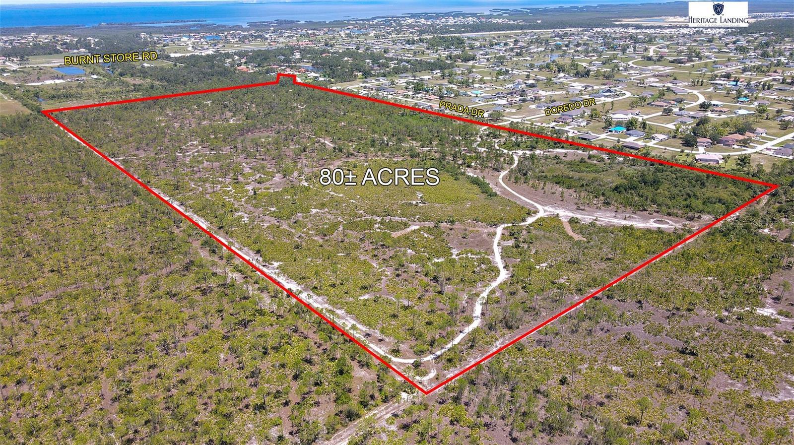 This property consists of 80 acres of residential land located just off of Burnt Store Road in Punta Gorda. It's currently zoned PD (Planned Development) with approval for up to 270 townhouses. There are utilities to the site and there is a lift station along the northern boundary. It is located in a growing area as there are multiple new developments occurring within Burnt Store Village and Punta Gorda. The property is located at 17050 Burnt Store Road in Punta Gorda in Charlotte County. It's adjacent to the Woodlands Estates community. Access is provided by taking Harborside Blvd. from Burnt Store Road. The property is centrally located as it's only 10 minutes to US 41 and less than 15 minutes to I-75. It's also in close proximity to Cape Coral (10 minutes), downtown Punta Gorda (15 minutes), Fort Myers (20+ minutes), and it's only an hour to Naples & Sarasota.