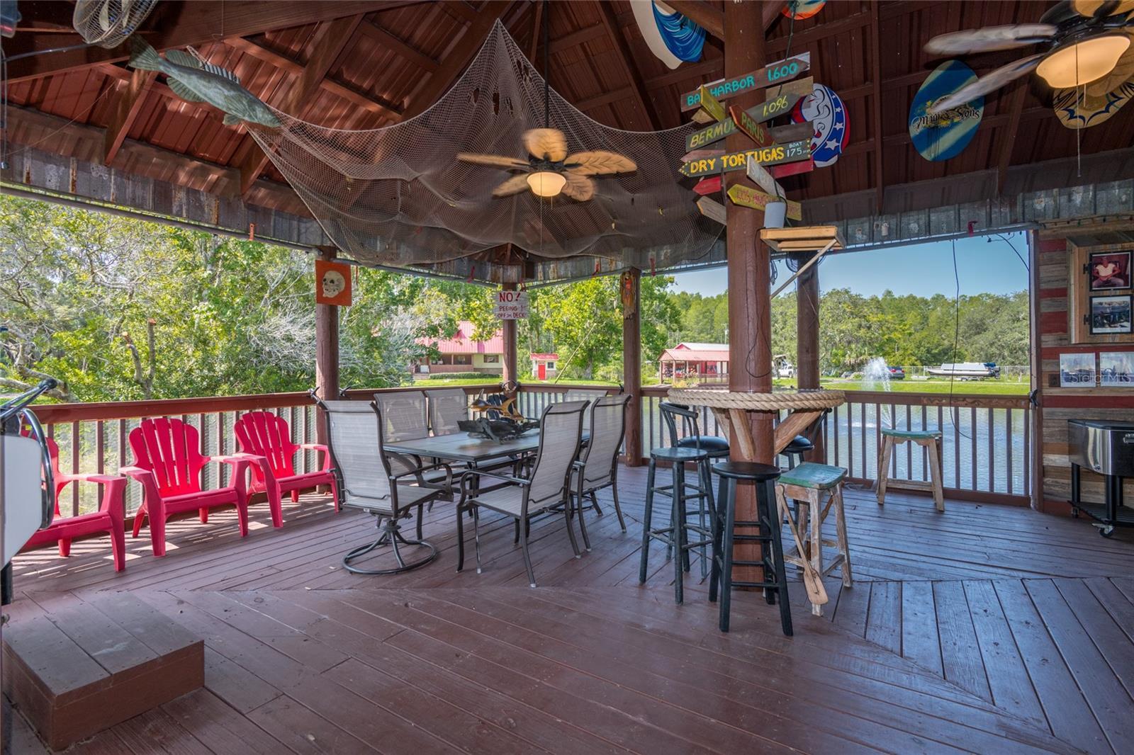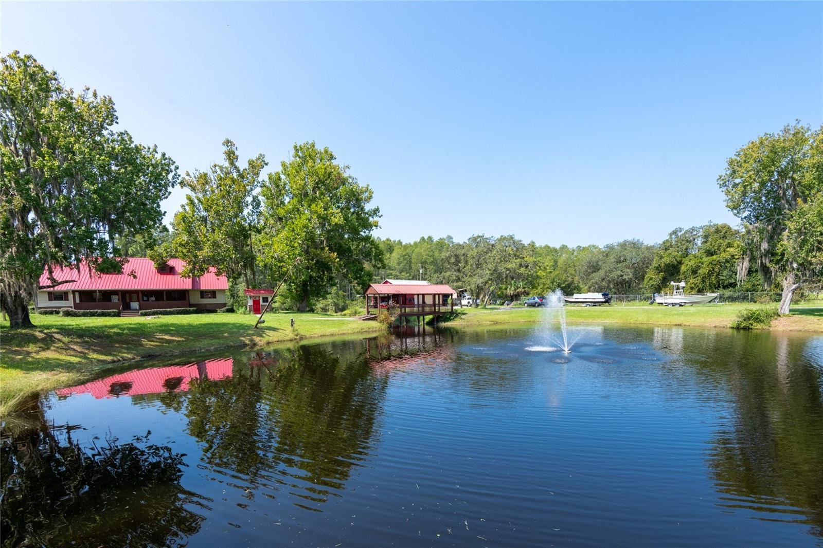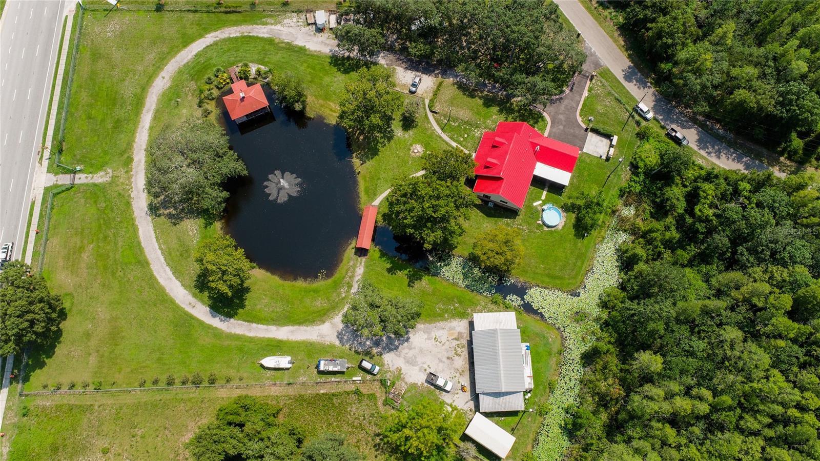 IT'S Incredible! LIVE, WORK, and PLAY ALL on 3.5 acres. It has 330 ft. on SR 52. Comfortable 3 bedroom, 2 bath home. First bathroom has a tub and a separate shower. The other bath has a large shower stall. The bedrooms are large, could be a 4 bed, if you used the upstairs loft room. Office space on the first floor. It has a large kitchen, with a cove around the stove. Eat off countertop and room for a dining room table. You can sit on the front porch overlooking the fish filled pond or take a walk across the covered bridge to the 3 plus car garage. A man cave is there, with an A/C. A boat house is on the pond with a view of the fountain. Electric and water are already available. Fans, screening are available when the bugs are bad. There is an RV space under the shade trees. There's so much more ! It all could be yours! Make an appt.