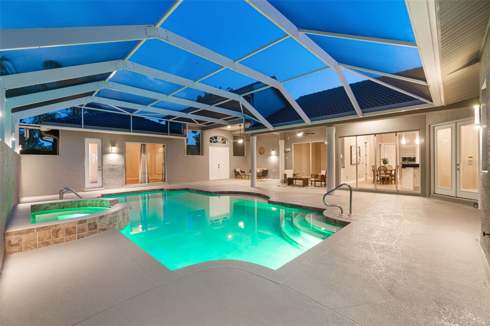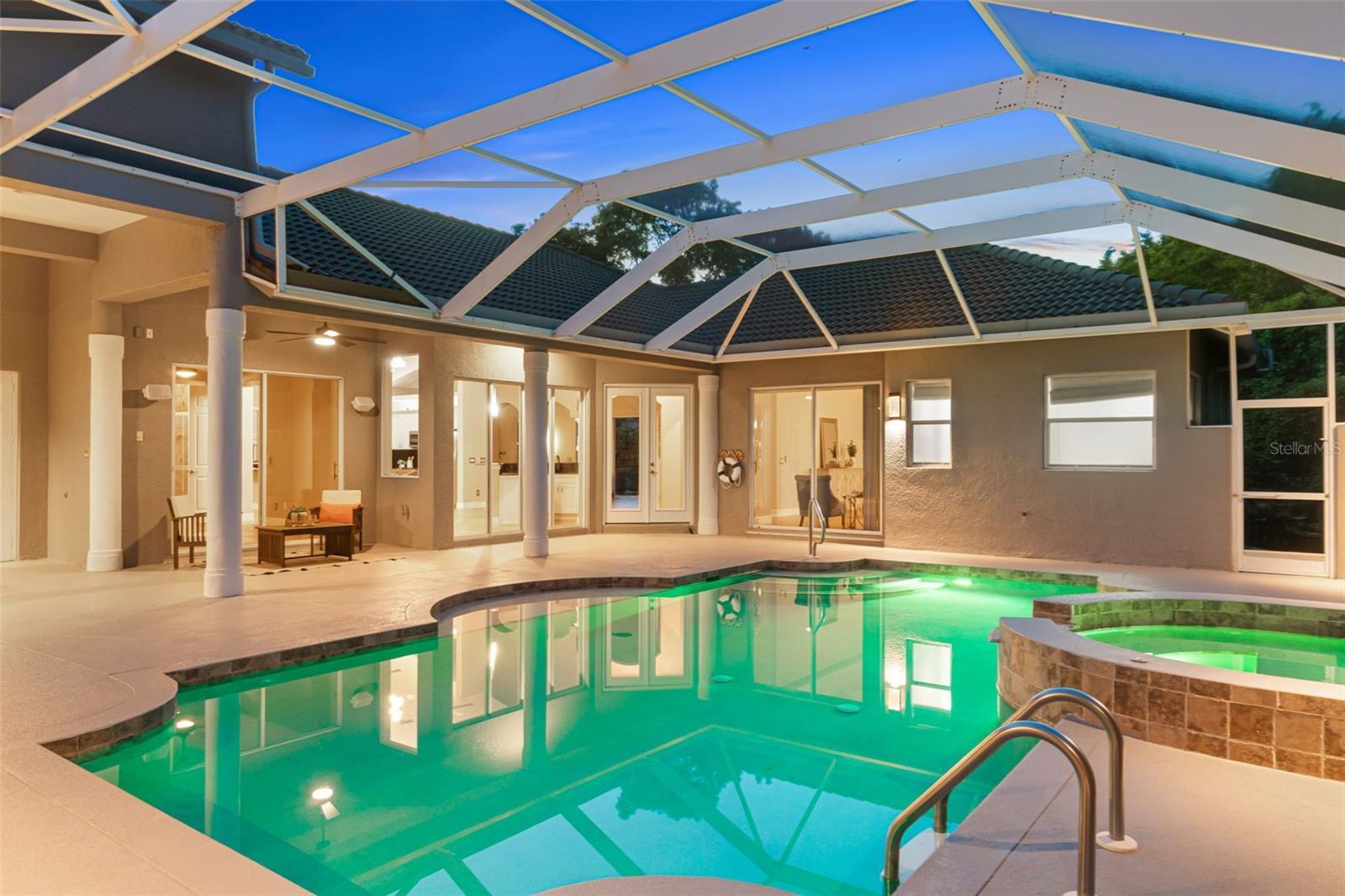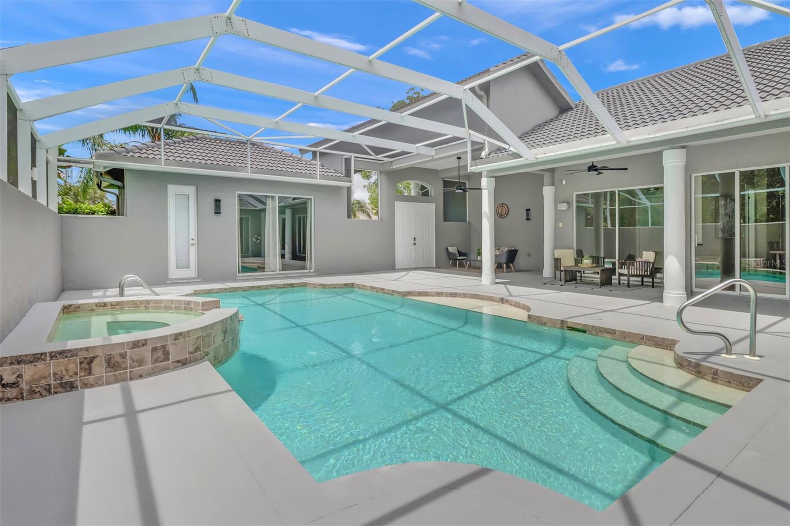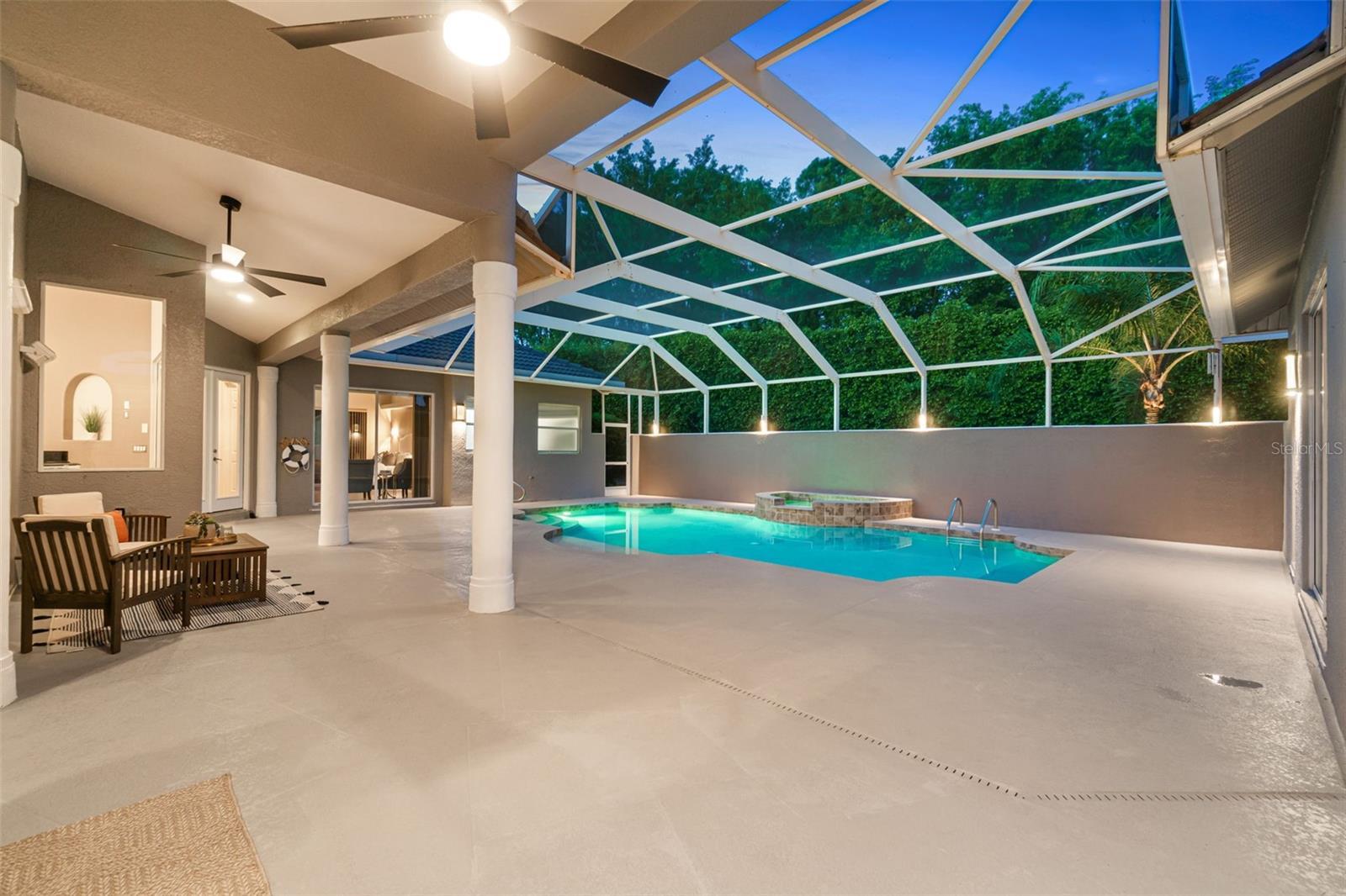 Luxurious Home in the Prestigious Wilshire Lakes Gated Community Welcome to your dream home in the highly desirable Wilshire Lakes community. This exquisite residence welcomes you with a stunning courtyard design, accessible from multiple rooms throughout the home. At its heart lies a serene, lighted, and heated pool and spa with a cascading waterfall—perfect for relaxation or entertaining. The screened courtyard offers both sun and shade, complemented by new pool heating, filtration, lighting, and ceiling fans to create the ultimate year-round oasis. Step inside to discover a beautifully maintained contemporary layout featuring 4 spacious bedrooms and 3.5 baths. The expansive open kitchen impresses with high vaulted ceilings, new cabinetry showcasing rare Brazilian granite countertops with beveled edges, striking hardware and lighting, and a wet bar ideally positioned for conversation. Appliances include a pot-filling tap over the stove, microwave, refrigerator, and new dishwasher, along with a built-in desk area and walk-in pantry for ample storage. Built in 2005, this home boasts abundant natural light through extra windows that frame peaceful views. French doors open from the lanai to a poolside lavatory with artistic tile accents and a pedestal sink. Passing through grand pillars and vaulted ceilings, the living room offers a tranquil retreat with lush privacy landscaping and a lake view backdrop. The primary suite serves as a true sanctuary, featuring an ensuite bath with a tile shower, spa tub, dual sinks, a vanity, a large walk-in closet, a linen closet, and a private water closet. Sliding doors lead directly to the courtyard and a private side porch or dog run. A spacious laundry room with granite countertops, generous cabinetry, washer/dryer, and utility sink connects to the two-car garage, which includes hurricane shutters and attic access. The courtyard also features a private guest cabana or in-law suite with a separate entrance, full kitchenette (stove, refrigerator, sink, and cabinetry), full bath, closet, and its own AC unit—perfect for guests or extended family. The exterior has been freshly painted and professionally landscaped, complete with lighting, new sod in the front and side yards, and a new roof (2019). Located on a private corner lot, this home enjoys low HOA fees, access to “A”-rated schools, and convenient proximity to North Naples shopping, dining, parks, and the beautiful Gulf beaches. Don’t miss the opportunity to experience luxury living at its finest—schedule your private tour of this exceptional Wilshire Lakes home today!