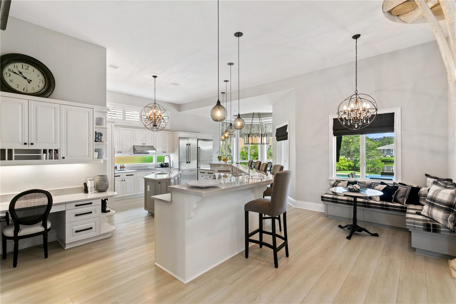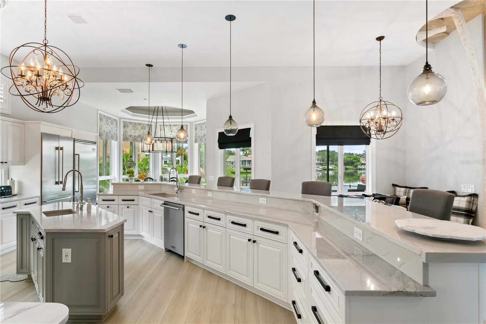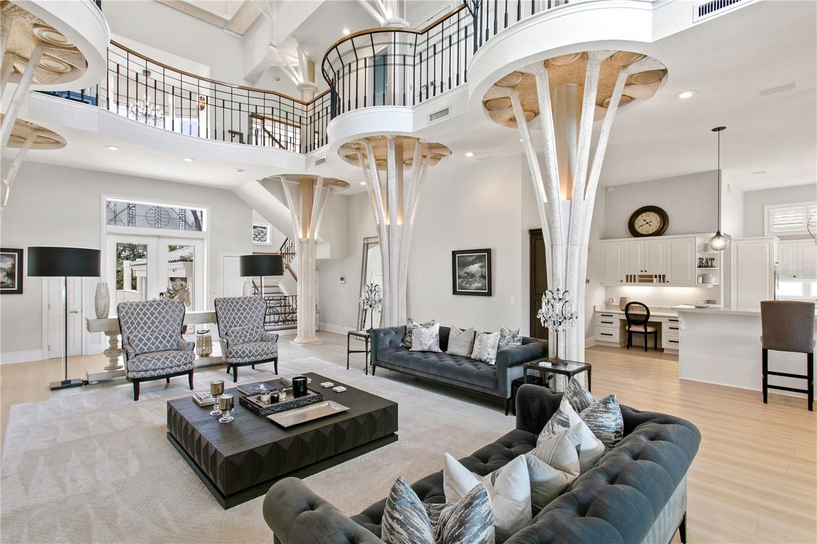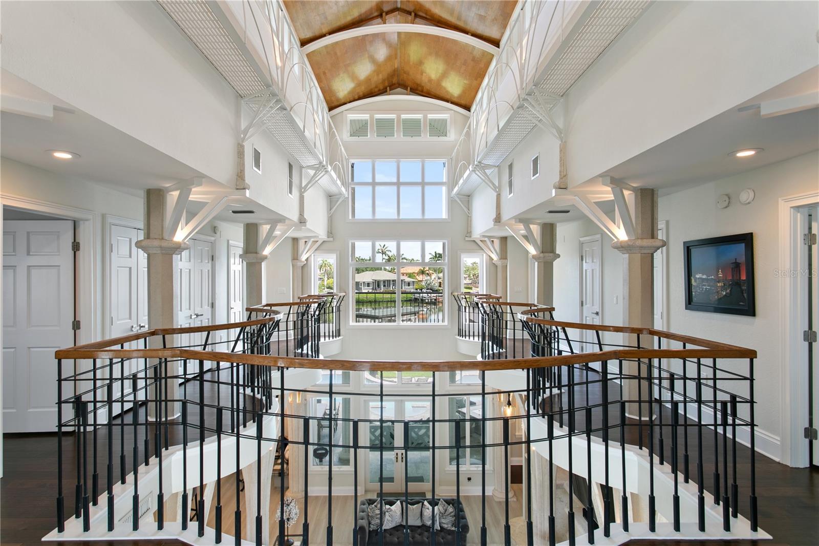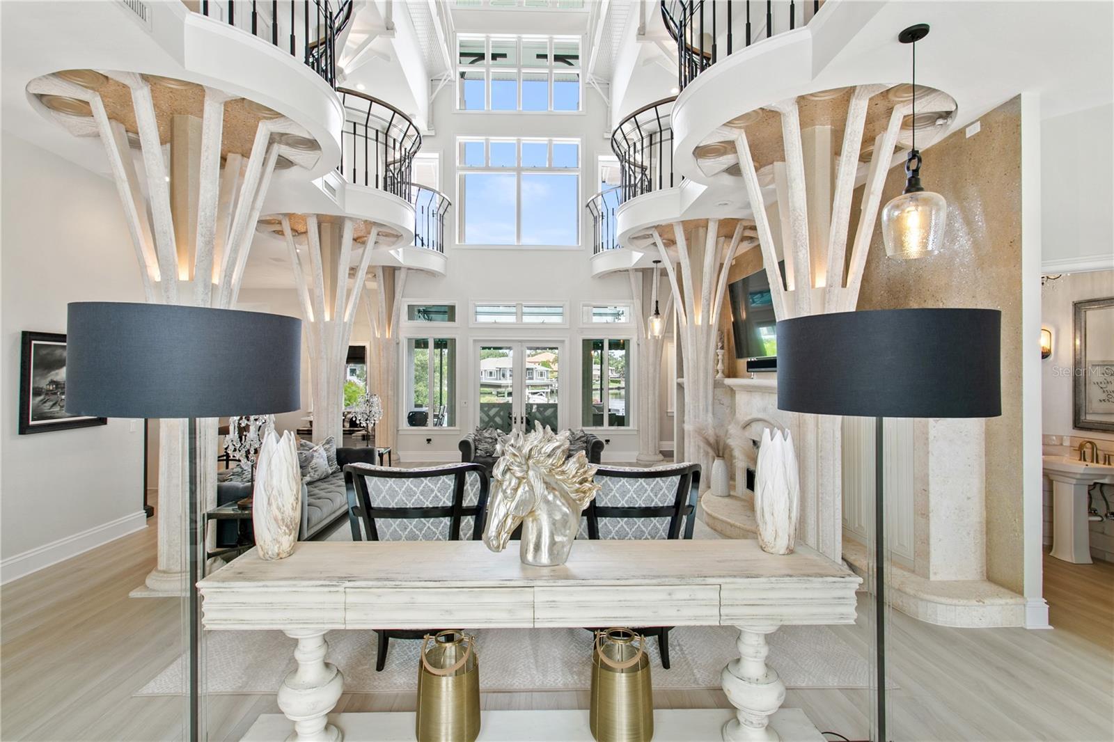 Welcome to this exquisite estate on Coffee Pot Riviera, a half-acre lot on a protected inlet of Tampa Bay. Right away you are drawn to the vine-inspired wrought iron gates making a striking first impression to the property's entrance. The overall style of the home pulls together unique architecture elements of organic, nature-inspired design. A jaw dropping grand entrance blends a functional structure requirement with a creative artistic design of columns that resemble the natural form and texture of trees allowing this three-story open living space to seamlessly integrate with the waterfront landscape. The tongue-and-groove ceiling of this space is reminiscent of a boat's hull, which enhances the spacious, open airy feel of the home, like the feeling of being on a luxury yacht. Bringing this all together, creates a magnificent three-story wall of windows flooding the house with natural light, offering views of the water and creating a seamless connection between the indoor and outdoor spaces. It’s simply stunning! Next you are drawn to the expansive outdoor area which was carefully designed to provide much-needed shade and comfortable, covered living space that connects beautifully to the extra large backyard, large infinity pool and waterfront. A grandfathered boat house offers a rare and valuable feature to protect your watercraft. Everything has been updated and enhanced by the current owners with the addition of new flooring throughout, updated bathrooms and kitchen, brand new metal roof and ALL (three) new AC units. An added bonus is the primary bedroom being on the first floor as well as another bonus room that could be used as a bedroom with a full bath, media room or office. The other guest bedrooms are all on the second floor. A four car garage (two have been converted to a gym) gives you the flexibility for extra cars or a workout space. This sophisticated design combined with Florida's tropical landscape will give you a luxurious yet comfortable living experience in the heart of fabulous St Pete! No flooding. Ready for immediate occupancy. Can be sold furnished. All furnishings new from Restoration Hardware, Arhaus, and Timothy Oulton.