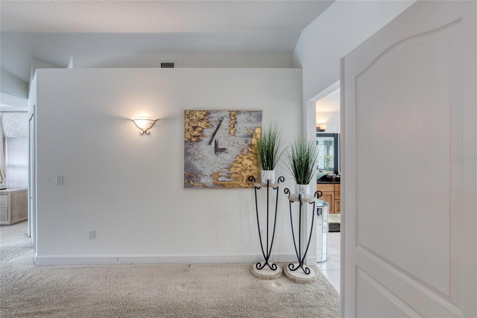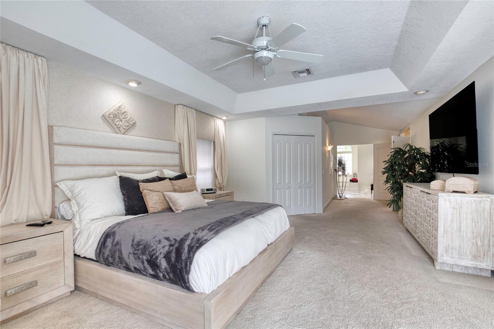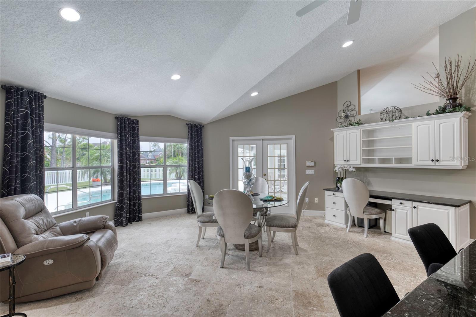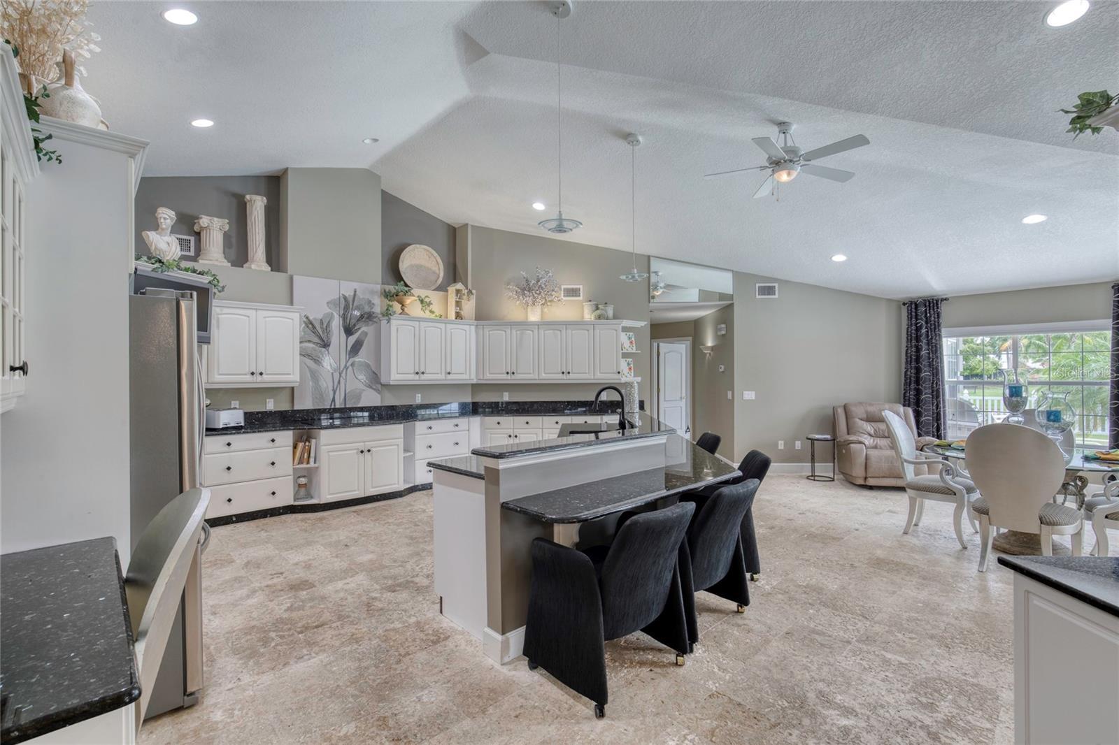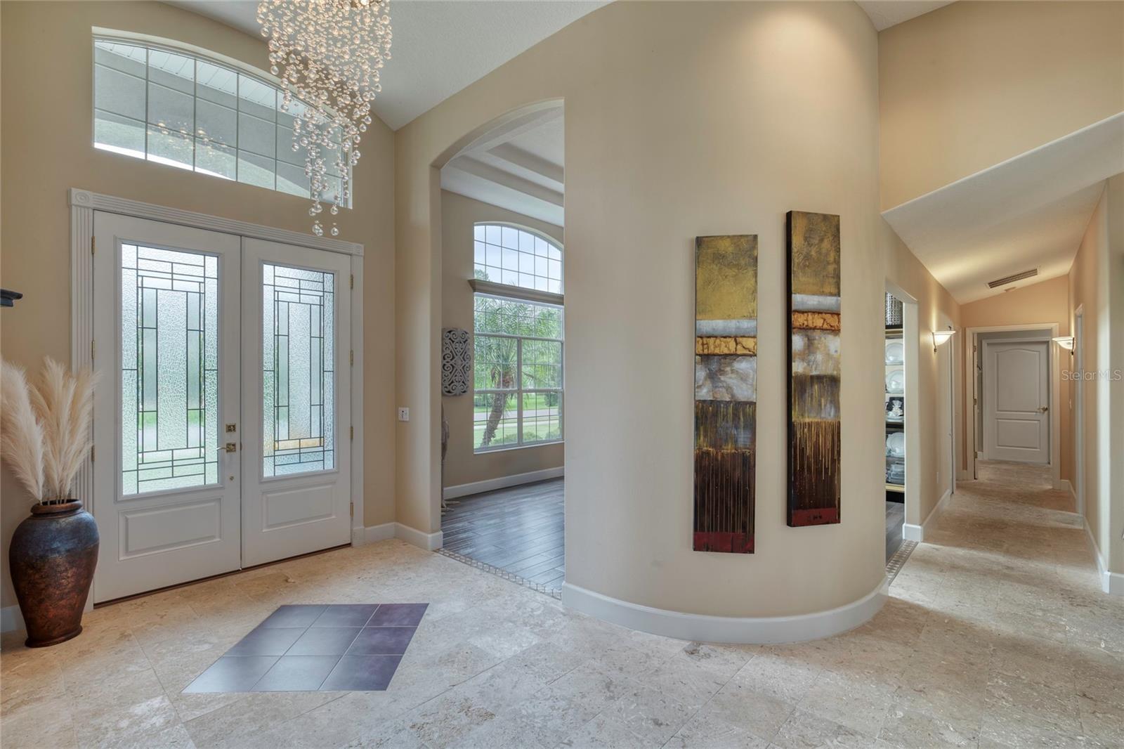 Welcome to 7 Foxford Chase, a spacious Lakefront Estate Home in the sought-after Hunters Ridge community of Ormond Beach. This 4-bedroom, 2 Full and 2 half Bathroom pool home sits on a large almost 1/2 Acre lot with a tiled roof, long driveway for plenty of extra parking, and 2-car garage. Step through the New Lead Glass double doors into a thoughtfully designed interior with amazing upgraded features . Vaulted ceilings throughout the living areas up to almost 13 ft. To the left is the formal dining room, and to the right, a formal living room perfect for additional seating or entertaining. Straight ahead, the sunken living room features three sets of French doors leading out to the lanai, and a built-in bar with glass cabinets, wine rack, sink, and mini fridge—ideal for hosting. Just beyond, the spacious kitchen offers granite countertops, white cabinetry, a cooktop, double ovens, and a center island with sink, dishwasher, and breakfast bar overlooking the sunny breakfast nook. The primary suite is tucked away for privacy, featuring French doors to the lanai, a walk-in closet, and a large en suite bath with dual vanities, private water closet, garden tub, and walk-in shower. The second full bathroom also includes a dual vanity and walk-in shower. A generous laundry room with utility sink and full wall of storage cabinets leads to the garage for added convenience. Out back, enjoy your own private oasis with a New fenced yard, sparkling pool and spa, and a covered lanai with plenty of room for seating or outdoor dining. Enjoy the serene Lake with a beautiful fountain just beyond the pool. All of this is set within a quiet, established neighborhood. Perfectly situated just minutes from top-rated schools, popular restaurants, grocery stores, and local parksplus, only 15 minutes from the beach. Don't miss outschedule your showing today!