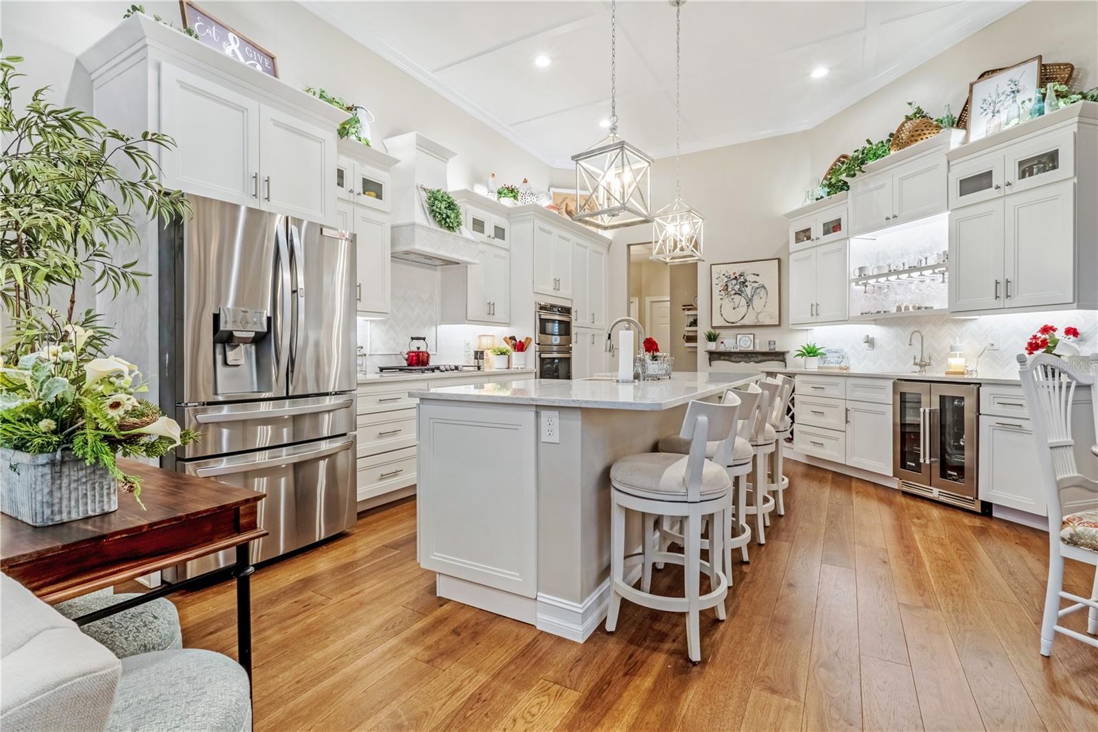 - Built-in Features, Coffered Ceiling(s), Crown Molding, Eat-in Kitchen, High Ceilings, Kitchen/Family Room Combo, Living Room/Dining Room Combo, Open Floorplan, Primary Bedroom Main Floor, Solid Wood Cabinets, Split Bedroom, Stone Counters, Thermostat, Tray Ceiling(s), Walk-In Closet(s), Wet Bar, Window Treatments