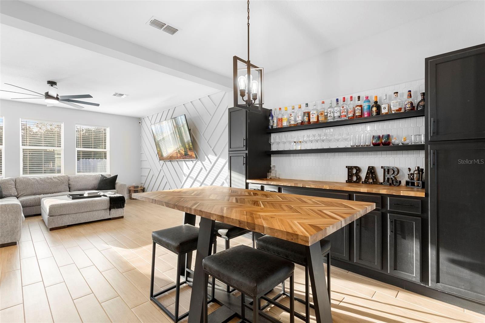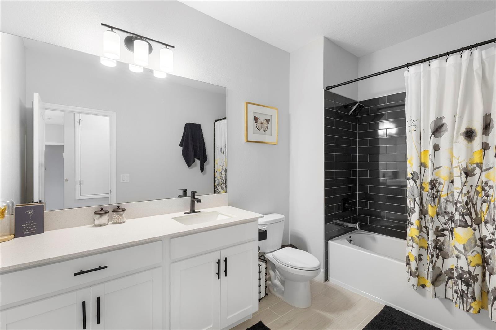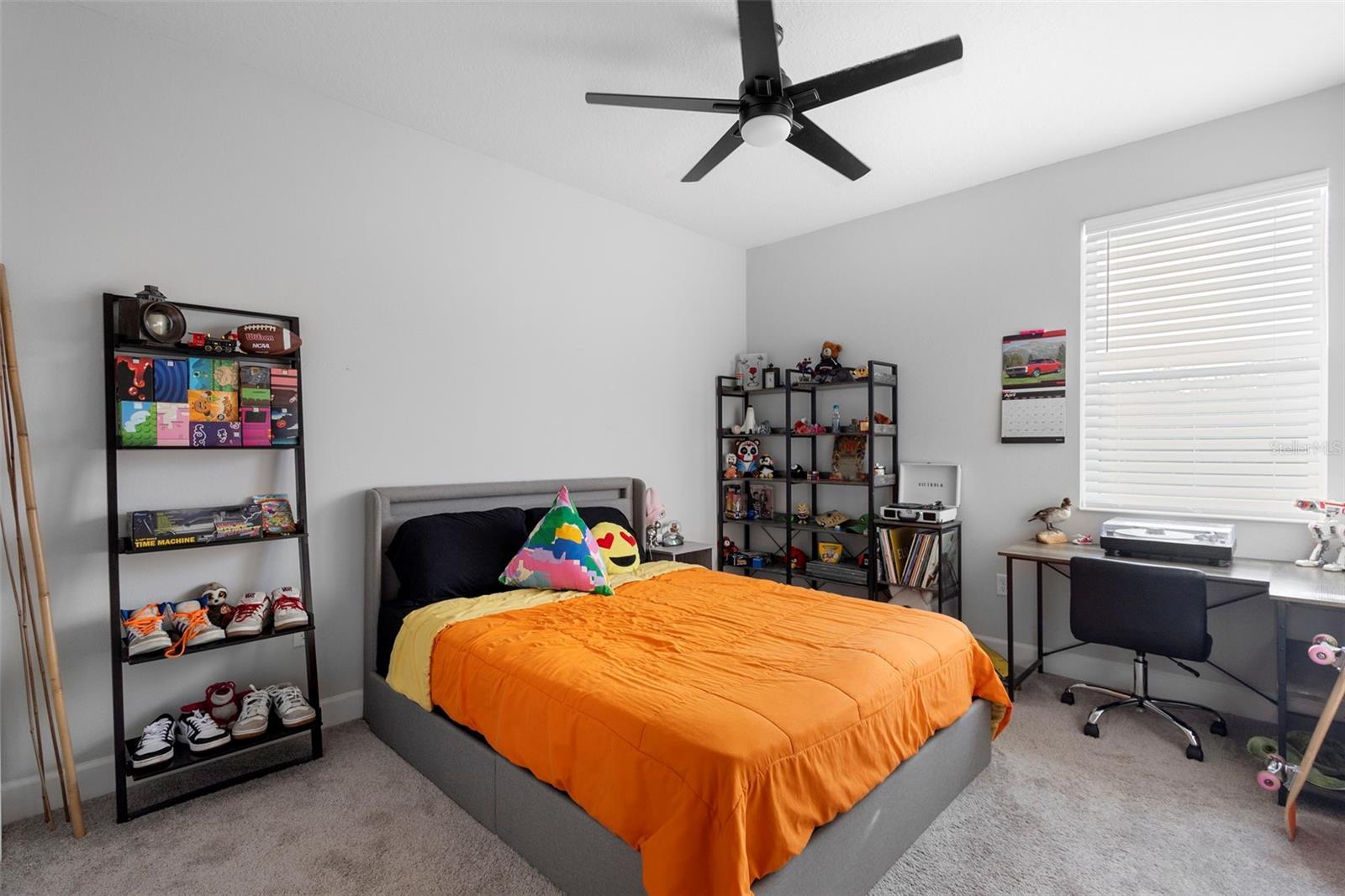 Welcome to this exceptional 3,120 sq. ft. two-story home, completed in 2023 and cared for with impeccable attention to detail. Offering 6 spacious bedrooms and 3 full bathrooms, AND a private yard on the largest lot in the neighborhood. This home provides the ideal blend of modern comfort, generous living space, and thoughtful design; including the placement of the HVAC! Downstairs, the open living, glamourous kitchen and dining areas flow seamlessly, offering an inviting atmosphere for everyday living and entertaining with a custom island and built in bar area. A bedroom with a walk-in closet and a full bathroom with floor to ceiling tile and a frameless glass shower completes the first floor. A 3-car garage provides ample space for vehicles, storage, or hobby needs. Upstairs, the expansive primary suite is a true retreat, featuring two walk-in closets and a beautifully appointed primary bath with a frameless glass shower, no tub, linen closet, and separate vanities; offering plenty of counter and storage space. All bedrooms include carpet flooring and ceiling fans, creating a cozy, comfortable environment throughout. One of the upstairs bedrooms has been tastefully transformed into a home theater with surround sound! An added bonus is the large upstairs laundry room, positioned perfectly for convenience. With modern construction, stylish finishes, and meticulous upkeep, this home is truly move-in ready and designed to impress.