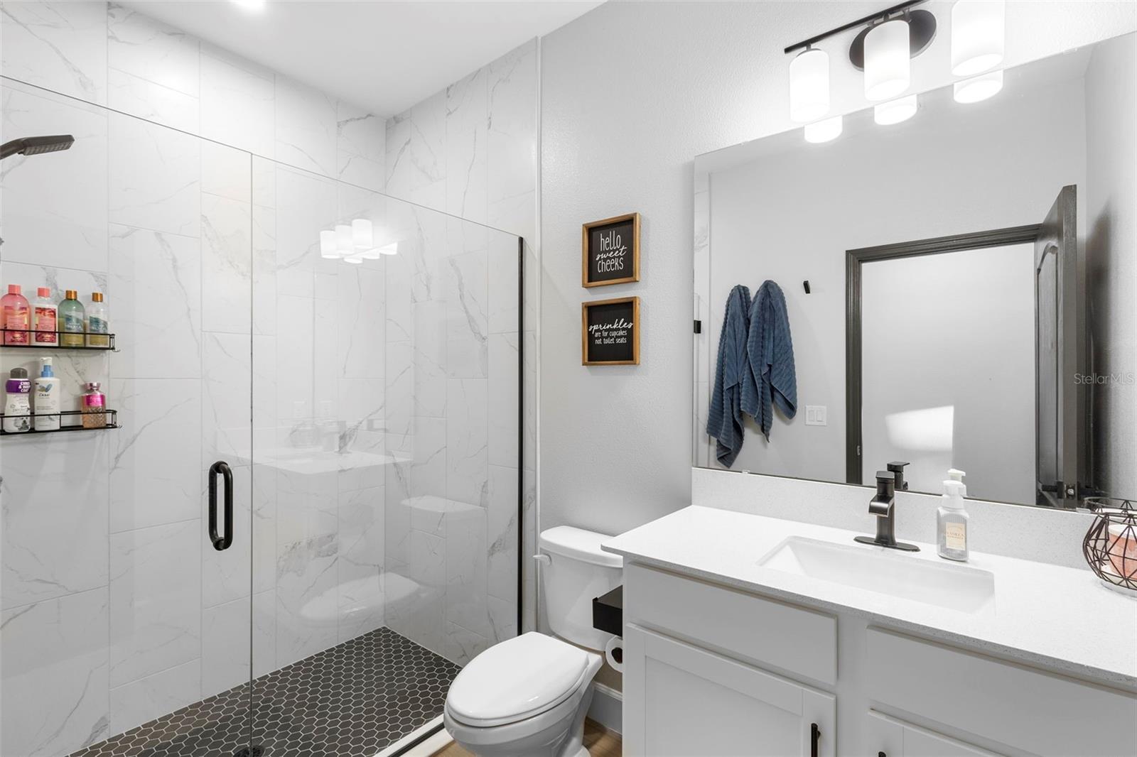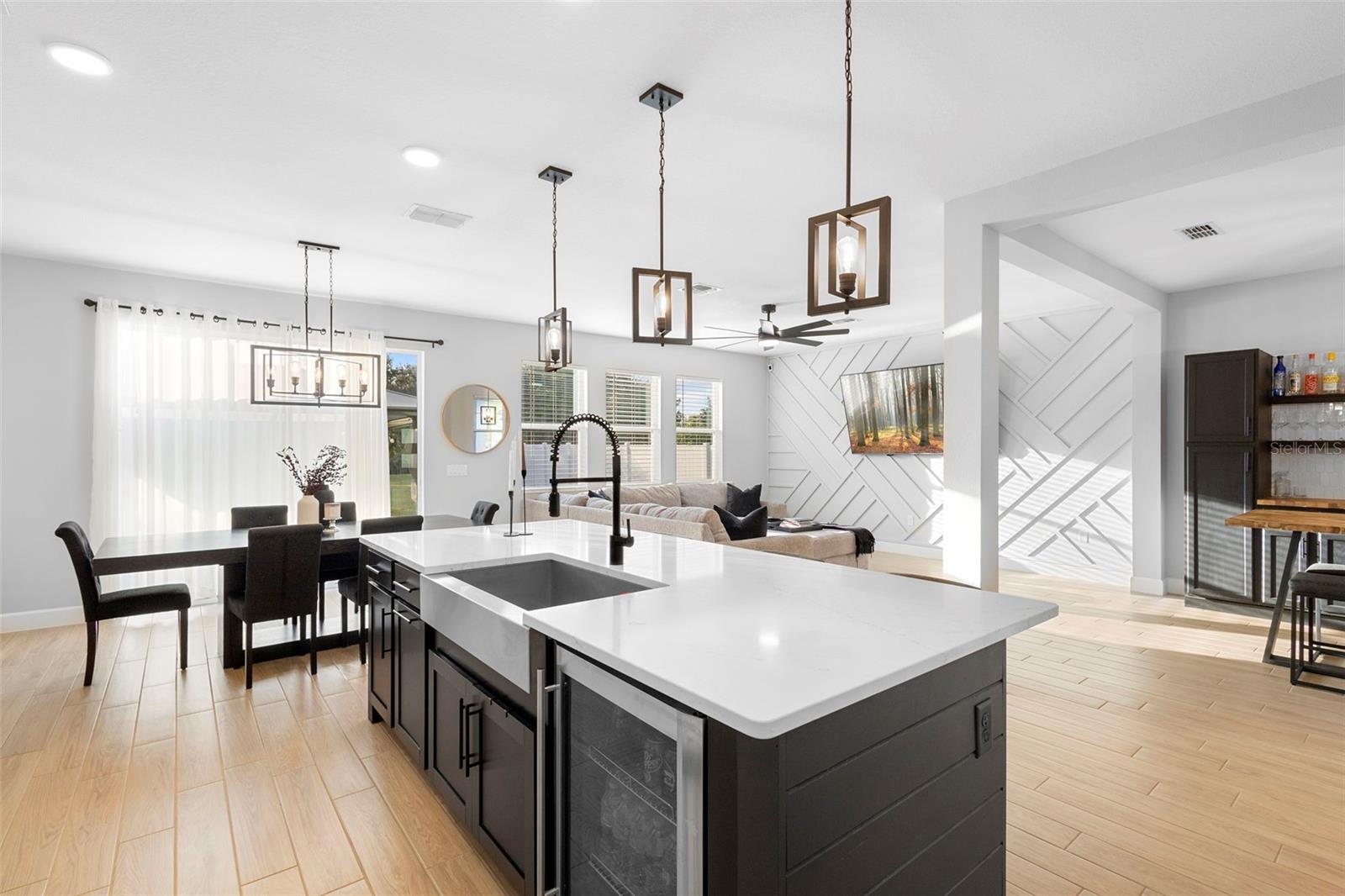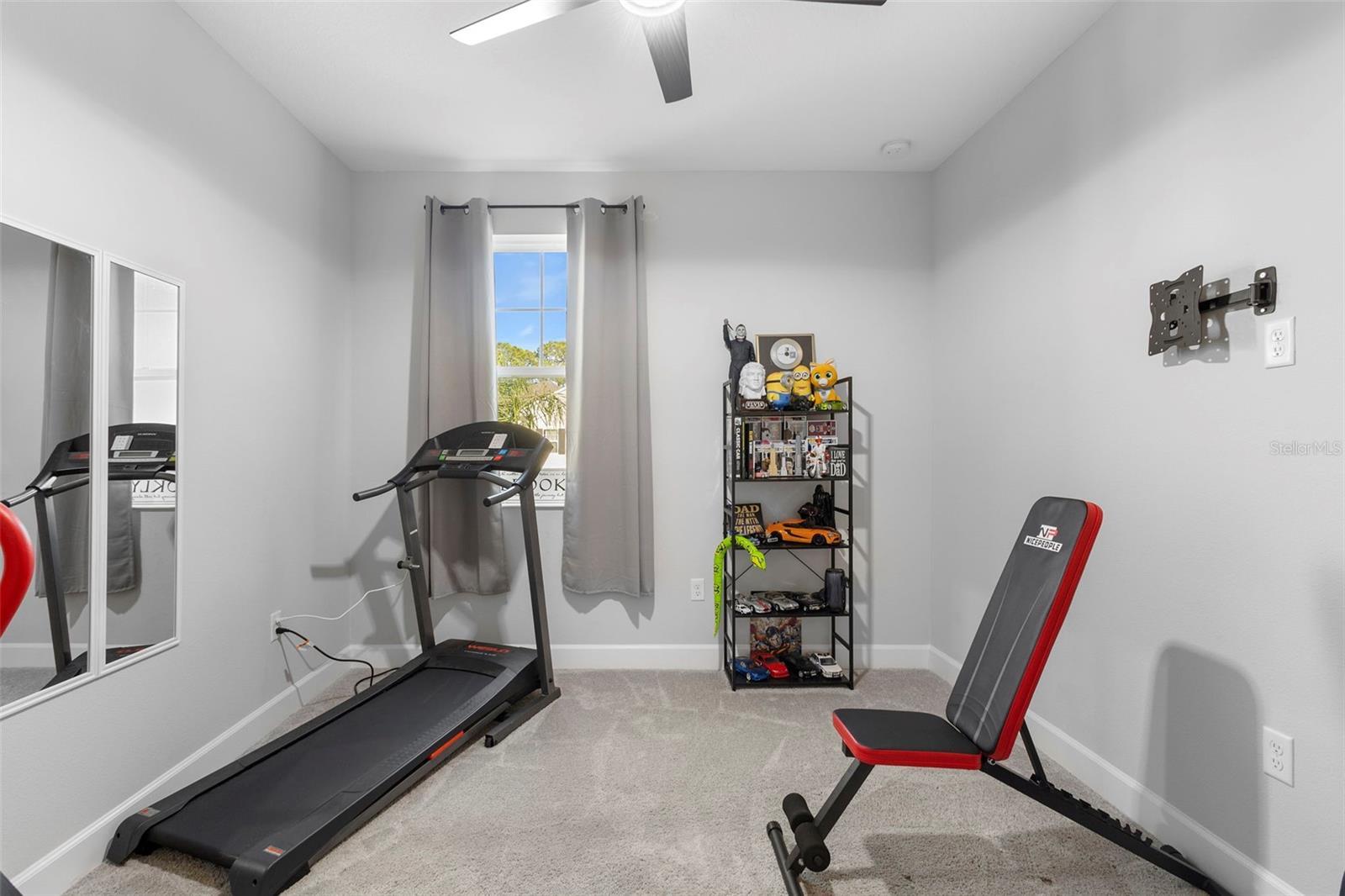 Welcome to this exceptional 3,120 sq. ft. two-story home, completed in 2023 and cared for with impeccable attention to detail. Offering 6 spacious bedrooms and 3 full bathrooms, AND a private yard on the largest lot in the neighborhood. This home provides the ideal blend of modern comfort, generous living space, and thoughtful design; including the placement of the HVAC! Downstairs, the open living, glamourous kitchen and dining areas flow seamlessly, offering an inviting atmosphere for everyday living and entertaining with a custom island and built in bar area. A bedroom with a walk-in closet and a full bathroom with floor to ceiling tile and a frameless glass shower completes the first floor. A 3-car garage provides ample space for vehicles, storage, or hobby needs. Upstairs, the expansive primary suite is a true retreat, featuring two walk-in closets and a beautifully appointed primary bath with a frameless glass shower, no tub, linen closet, and separate vanities; offering plenty of counter and storage space. All bedrooms include carpet flooring and ceiling fans, creating a cozy, comfortable environment throughout. One of the upstairs bedrooms has been tastefully transformed into a home theater with surround sound! An added bonus is the large upstairs laundry room, positioned perfectly for convenience. With modern construction, stylish finishes, and meticulous upkeep, this home is truly move-in ready and designed to impress.