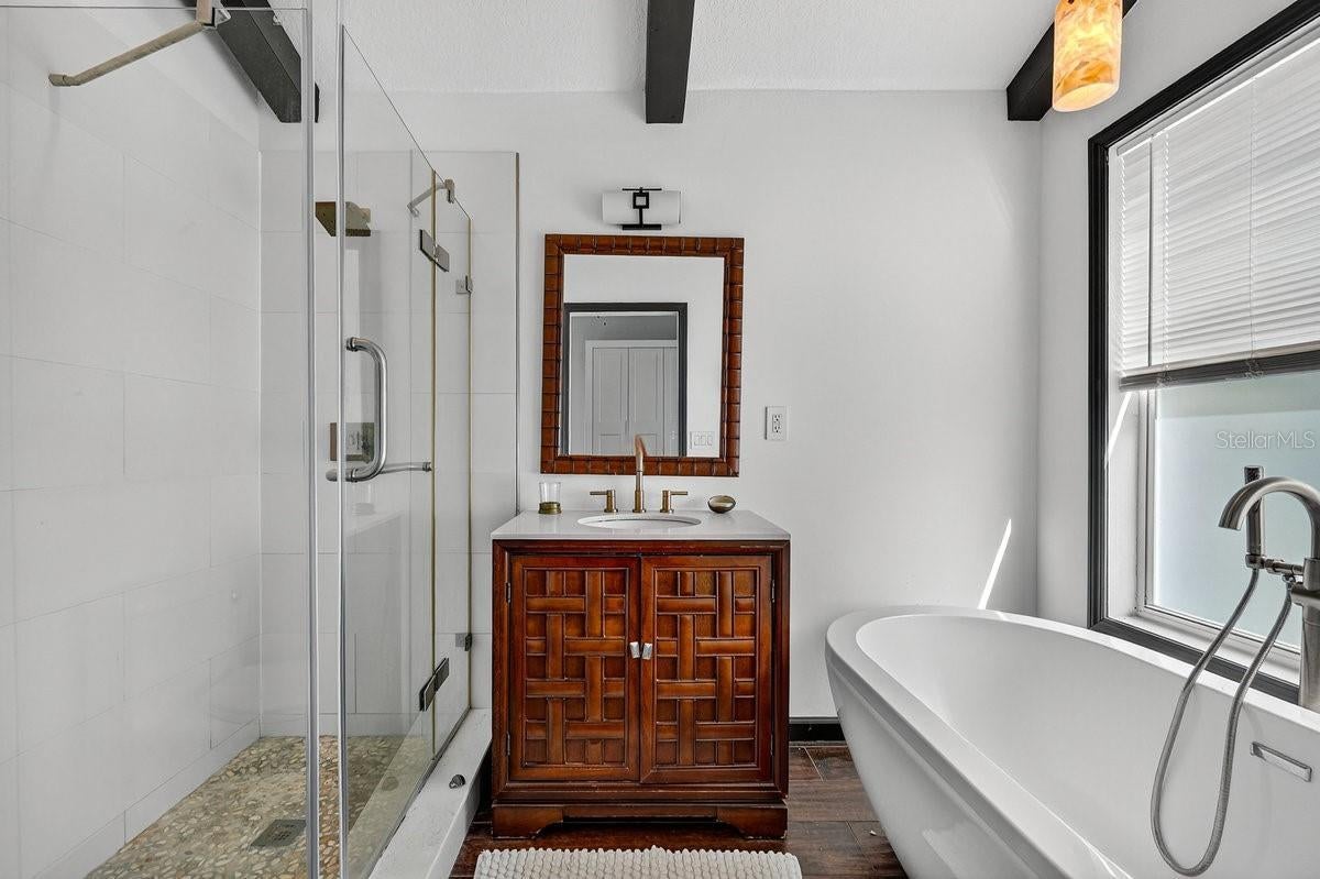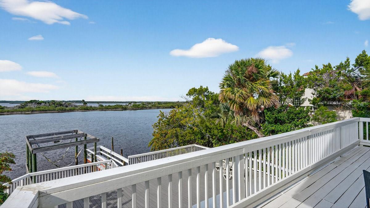 Framed by wide Halifax River views and lush tropical landscaping, 3110 John Anderson Drive delivers the feel of a private resort wrapped into a 3-bedroom, 3-bathroom home. The double-door entry opens to an airy, open layout where high ceilings and sleek tile flooring guide you straight toward the water, and the main living area blends seamlessly with a modern kitchen featuring stainless steel appliances, a center island, open shelving, and clean coastal finishes that keep the space feeling fresh and relaxed. Upstairs, the owner's suite becomes a true retreat with exposed wood beams, a sliding barn door, and a spa-inspired bathroom anchored by a deep soaking tub, while an additional guest bedroom and full bath on this level give visitors their own comfortable hideaway. On the lower level, a second living room opens directly to the pool deck, making it easy to move gatherings outside for casual evenings by the water. The third bedroom is designed with four custom-built-in beds and its own full bathroom, creating a fun and functional space for family, grandkids, or friends to spread out and stay. Step out back and the property fully embraces its riverfront setting: a pool with generous deck space, a covered patio for alfresco dining, and lush tropical landscaping create a resort-style backdrop for everyday living. An outdoor shower tucked among the greenery adds a coastal, vacation-home touch, perfect after a day in the pool or on the boat. With a private deep-water dock and lift, the Halifax River essentially becomes your backyard playground ideal for boating, fishing, or exploring nearby islands, offering a lifestyle that feels both relaxed and elevated in one of Ormond Beach's most coveted riverfront corridors.