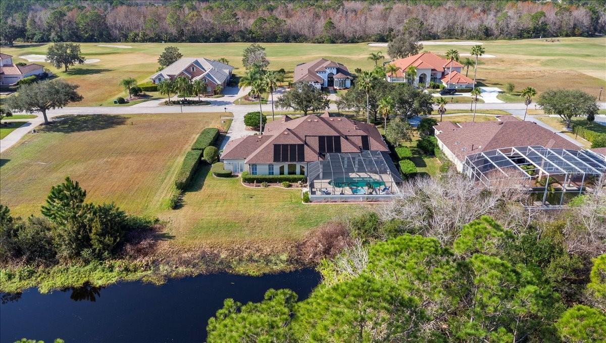 The epitome of privacy and luxury, the gated Lionspaw Grand neighborhood offers an upscale living community with easy access to world-class golf and a country club environment with an elevated Florida feel. This community HOA is well-managed by a professional. Homes infrequently become available in this area so this an excellent opportunity for a discerning buyer to be part of this only LPGA gated neighborhood. Located directly across the street from the 7th hole of the Jones LPGA Golf Course, this property sits within a private cul de sac and features a half-acre lot overlooking a lake and a lovely preserve. This home is an entertainment dream featuring French doors opening to an extra-large Lanai equipped with a full kitchen and expansive bar that includes a grill, refrigerator, sink, ice maker, and plenty of space to entertain. Swim year around in the beautiful saltwater pool on a travertine patio overlooking the lake and natural habitat. This four-bedroom, four full-bath estate home offers a light, bright, open floorplan with generous room for entertaining. The sophistication extends throughout with the continuous luxury flooring, the stainless and quartz kitchen which opens to the family room, the split-bedroom floor plan offering comfort and quiet, and access to the pool area from numerous points throughout the home. Easily entertain guests while also being able to retreat to your private, dedicated office when work calls. The large primary master suite features two walk-in closets and separate his and her vanities. The second primary suite located on the opposite end of the house extends the owners privacy and is ideal for guests The home has undergone a full cosmetic refresh, featuring: House painted - interior 2022-23; exterior 2024 Pass through/arch tile work 2022 New/updated kitchen paint - 2022 New vinyl luxury flooring updated throughout - 2022 Updated baths - 2024 New pool/jacuzzi heater 2024 New high throughput Gas meter installed 2024 - increased flow New AC unit - 2025 (1 of 2) Washer/dryer conveys; dryer is NEW/2025 New pool pump - 2025 Updated landscaping 2025 All information taken from the tax record, and while deemed reliable, cannot be guaranteed.