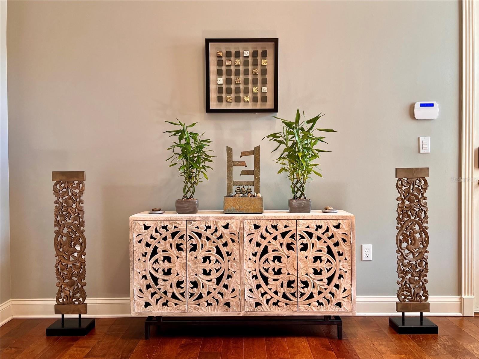 - Coffered Ceiling(s), Eat-in Kitchen, High Ceilings, Kitchen/Family Room Combo, Open Floorplan, Primary Bedroom Main Floor, Solid Wood Cabinets, Stone Counters, Window Treatments