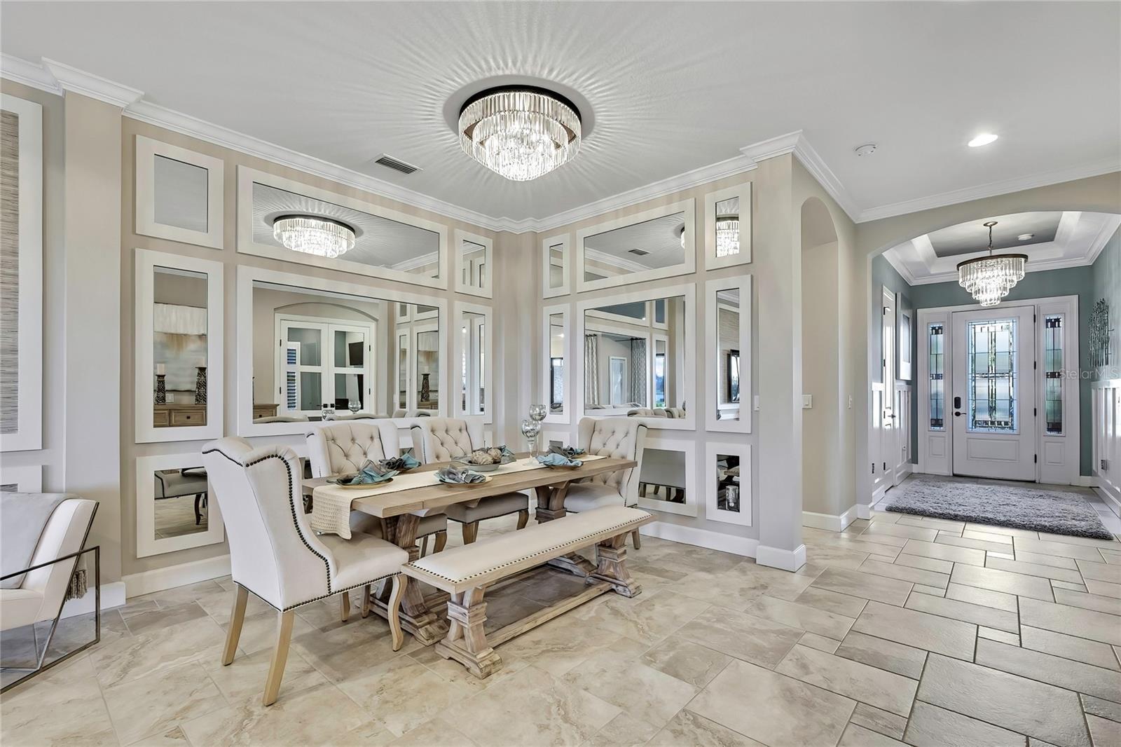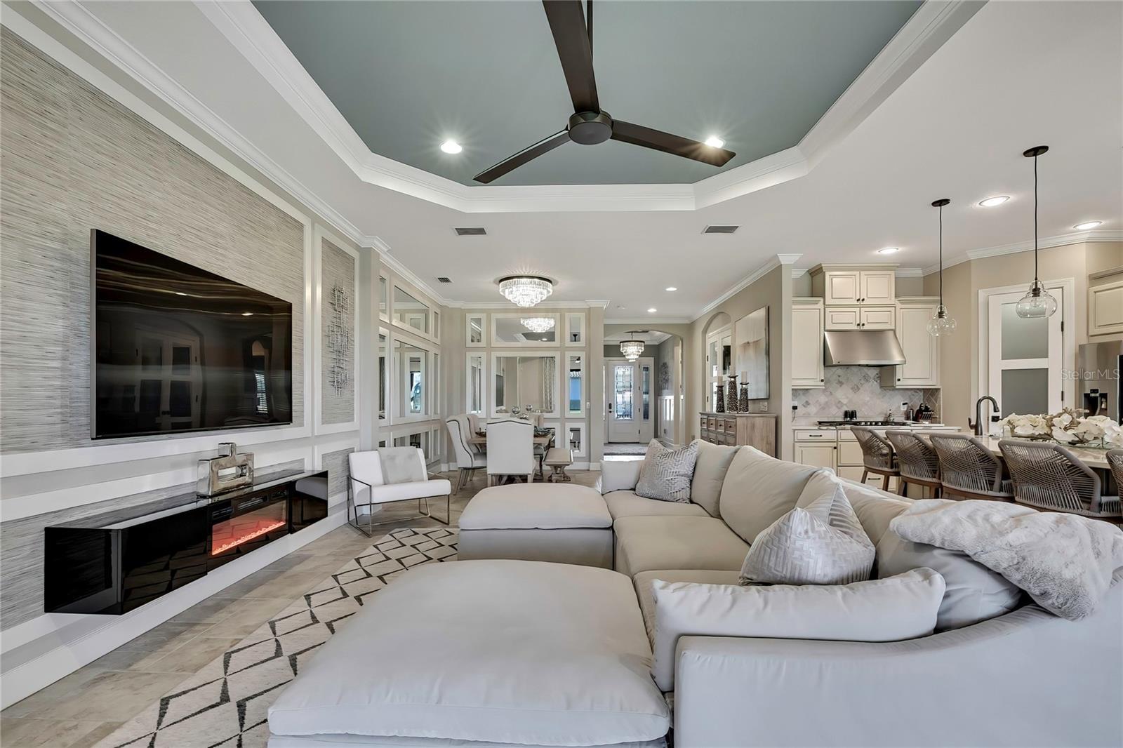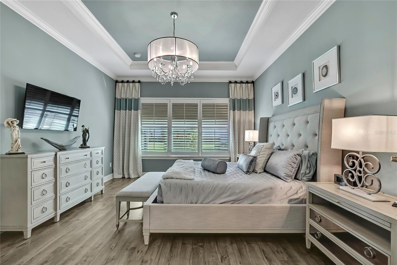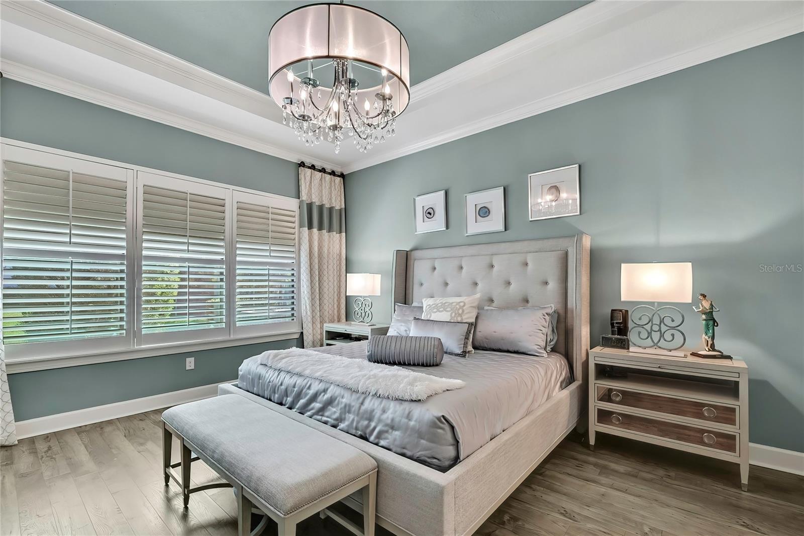 - Ceiling Fans(s), Crown Molding, Eat-in Kitchen, High Ceilings, Living Room/Dining Room Combo, Open Floorplan, Primary Bedroom Main Floor, Solid Surface Counters, Solid Wood Cabinets, Split Bedroom, Thermostat, Tray Ceiling(s), Walk-In Closet(s), Window Treatments