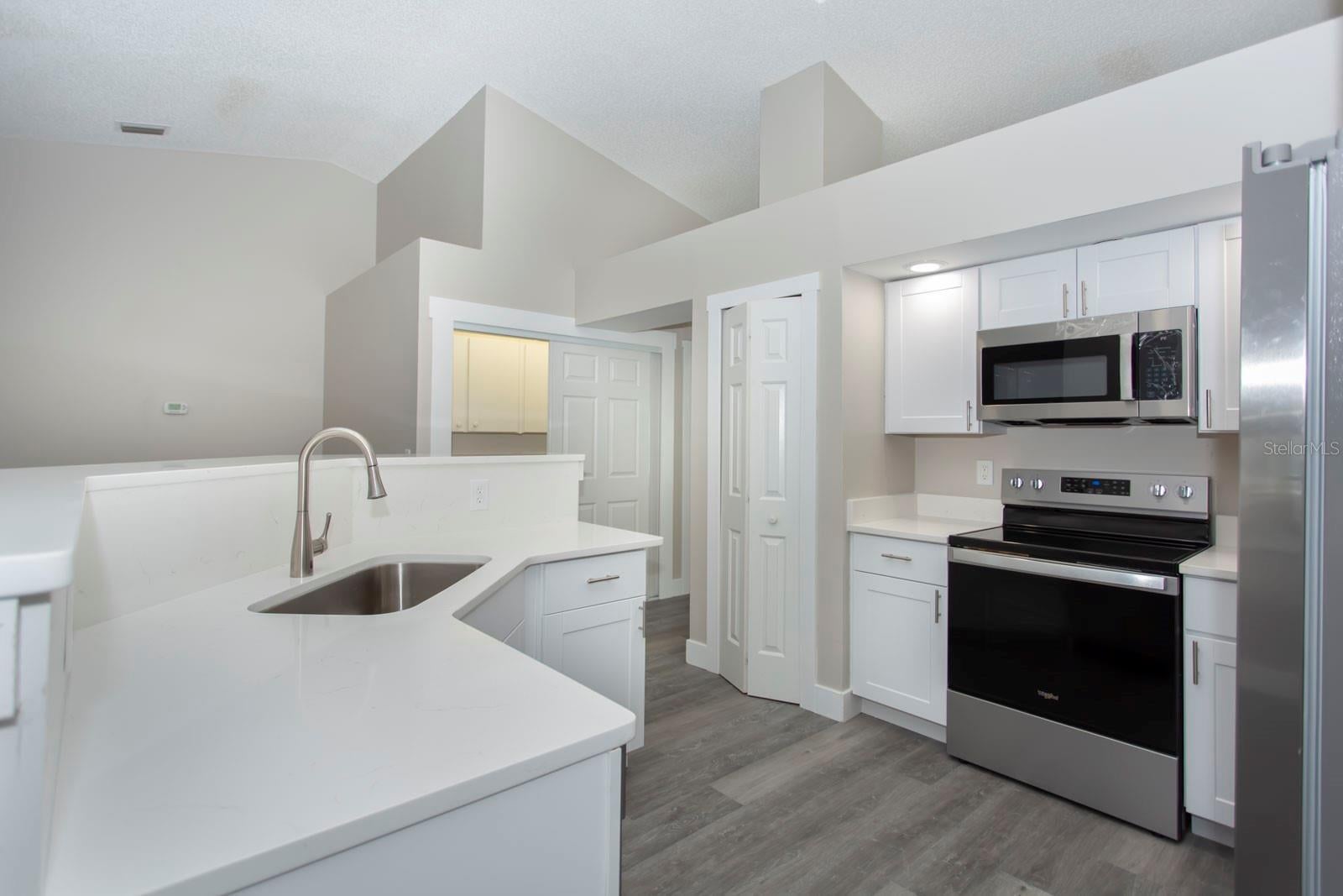 - High Ceilings, Kitchen/Family Room Combo, Open Floorplan, Solid Surface Counters, Solid Wood Cabinets, Split Bedroom, Stone Counters, Vaulted Ceiling(s), Walk-In Closet(s)