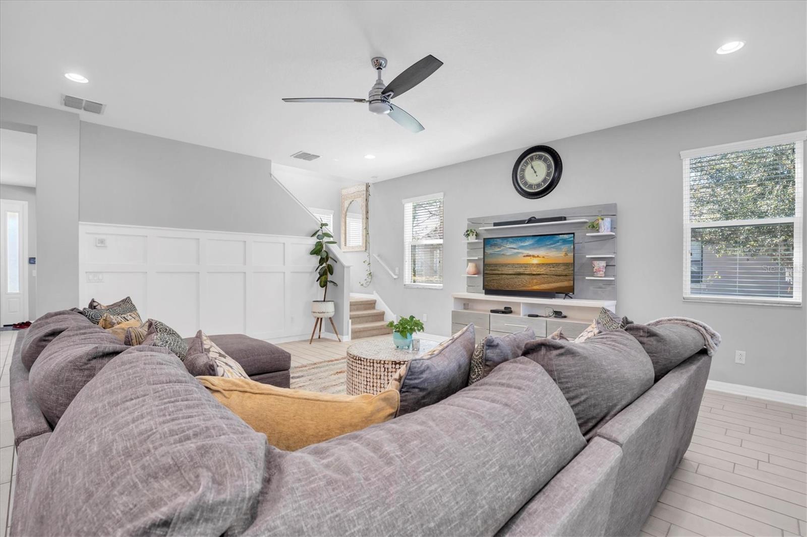 - Built-in Features, Ceiling Fans(s), Dry Bar, Eat-in Kitchen, Kitchen/Family Room Combo, Open Floorplan, PrimaryBedroom Upstairs, Solid Surface Counters, Solid Wood Cabinets, Stone Counters, Thermostat, Tray Ceiling(s), Walk-In Closet(s), Window Treatments